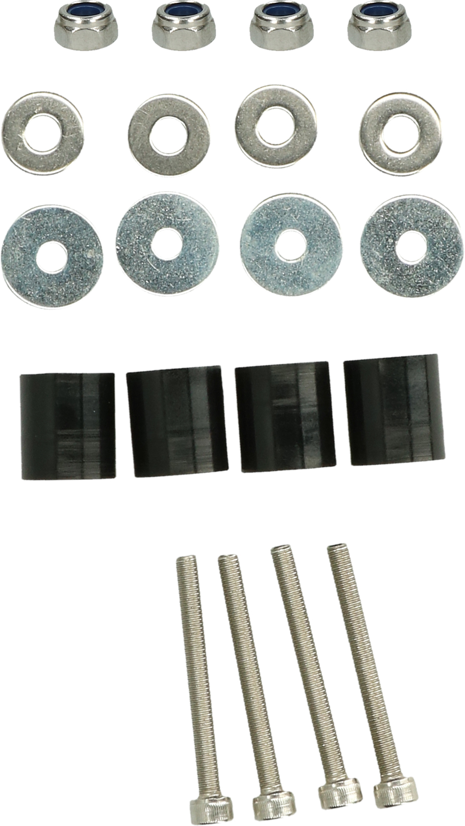 4 bolts, 8 covers, 4 rubbers and 4 screws