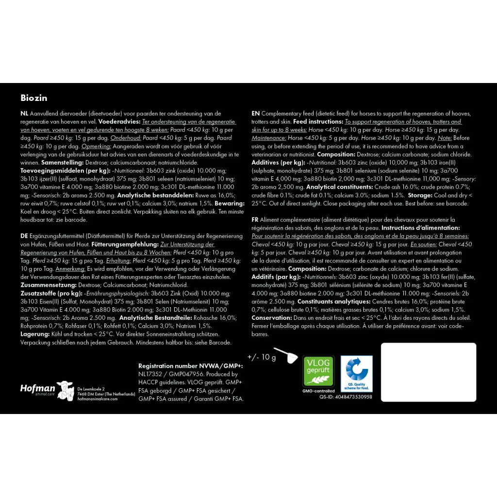 Biozin is a complementary feed (diet feed) for horses to support the regeneration of hooves, cot and skin.