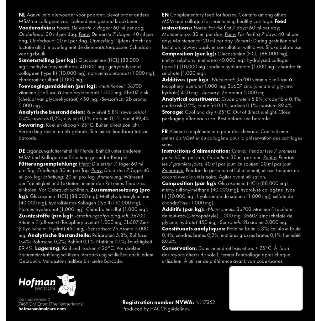 Glükoosamiin HCl (88 000 mg/kg), metüülsulfonüülmetaan (MSM, 40 000 mg/kg), hüdrolüüsitud kollageen (10 000 mg/kg), naatriumhüaluronaat (1 000 mg/kg), kondroitiinsulfaat (1 000 mg/kg).