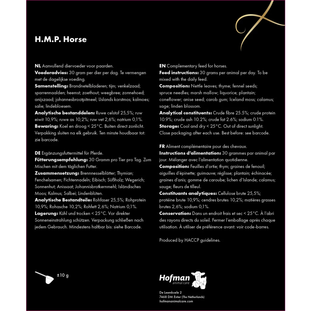 H.M.P. Horse is aromatic and very tasty and the powder mixes easily with feed and is therefore perfectly absorbable.