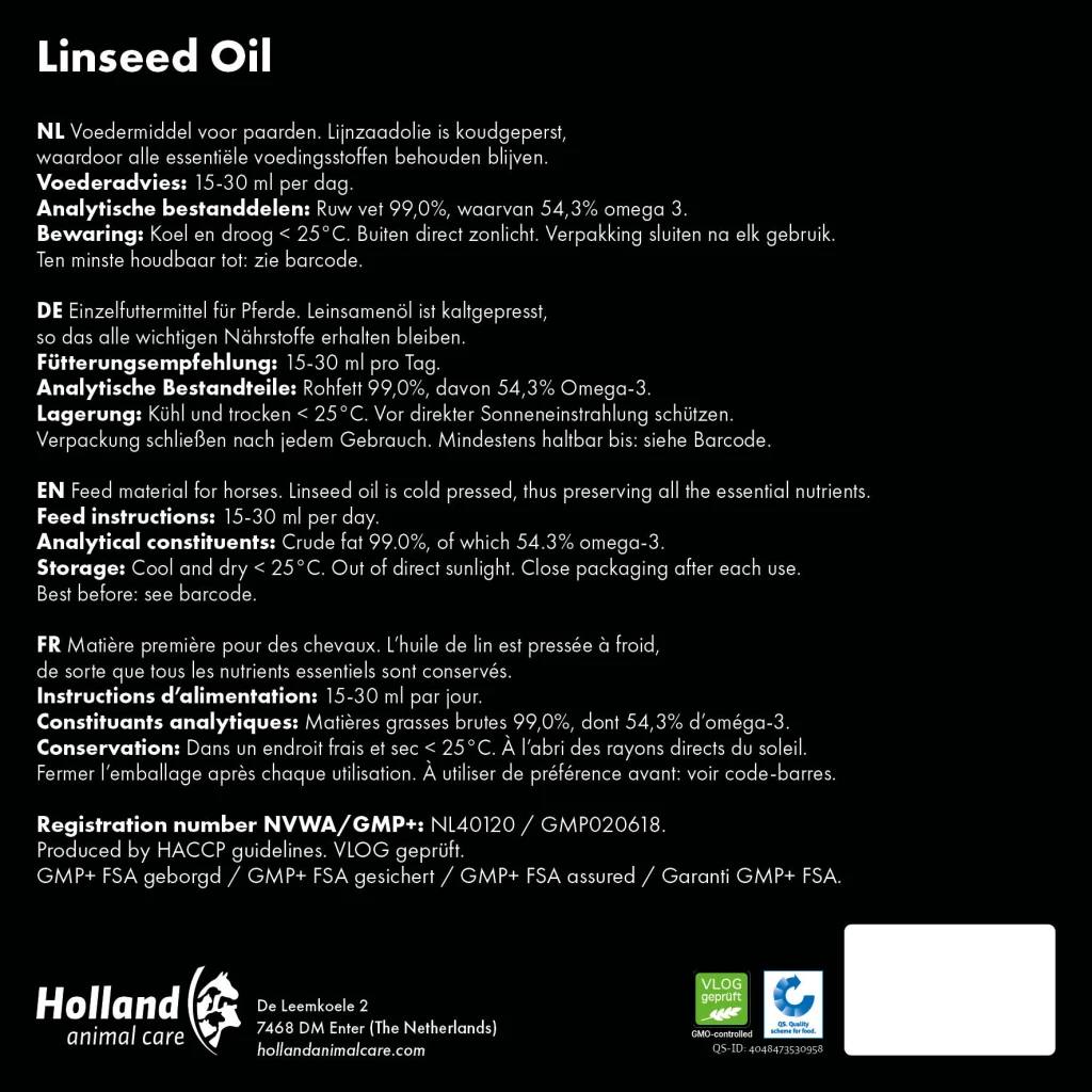 Linseed oil (Flaxseed oil) is a commonly used feed material by horse owners because of the high level of omega-3 fatty acids it contains. These fatty acids are essential for maintaining healthy skin and supporting the immune system in horses. In addition, linseed oil contributes to a shiny coat. This product is 100% cold-pressed linseed, leaving all natural active ingredients intact.