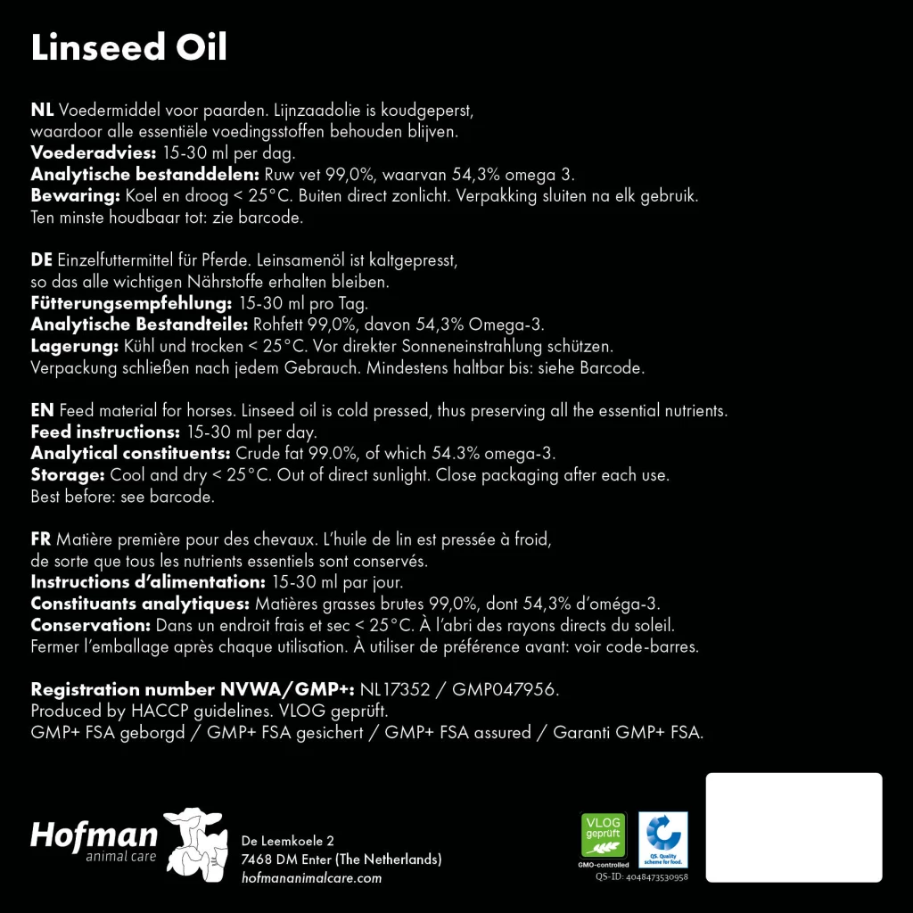 Kvaliteetne külmpressitud linaseemneõli hobustele, mis on rikas oluliste oomega-3-rasvhapete poolest. Need rasvhapped toetavad hobuse naha ja karvastiku tervist, aitavad säilitada immuunsüsteemi tasakaalu ning annavad karvale loomuliku läike.