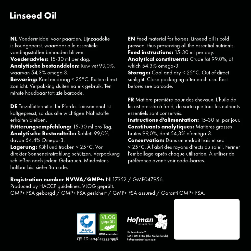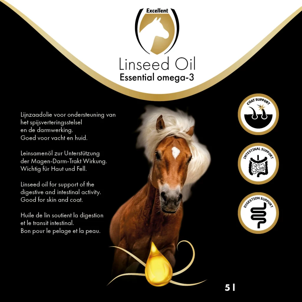 Linseed oil (Flaxseed oil) is a commonly used feed material by horse owners because of the high level of omega-3 fatty acids it contains. These fatty acids are essential for maintaining healthy skin and supporting the immune system in horses. In addition, linseed oil contributes to a shiny coat. This product is 100% cold-pressed linseed, leaving all natural active ingredients intact.