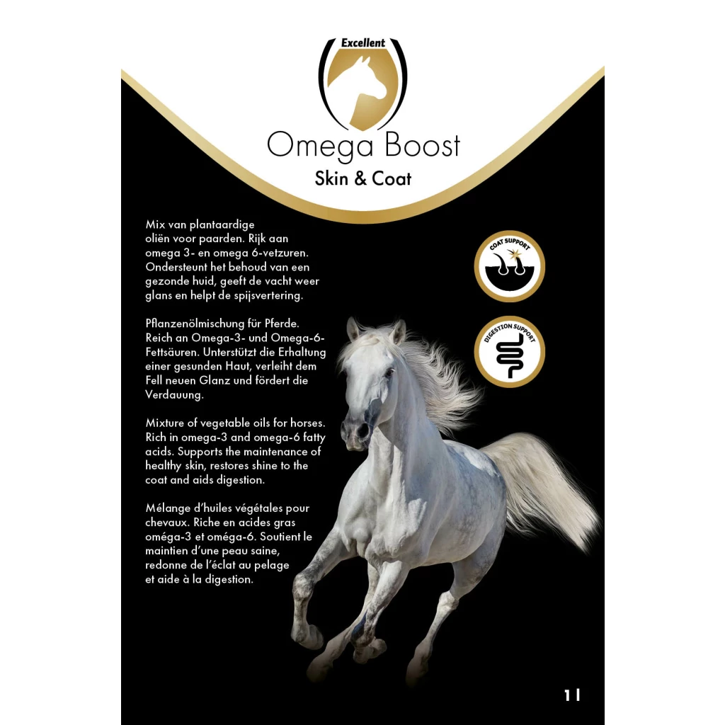 Equi Omega Boost is a complementary vegan feed for horses and consists of a mix of vegetable oils. These oils, which are rich in omega 3 and omega 6 fatty acids, have been specially selected to support the maintenance of healthy skin and restore shine to the coat. Omega 3 and omega 6 fatty acids are polyunsaturated fatty acids, which the body needs to function normally, but which the horse cannot produce itself. That is why these fatty acids have to be ingested through the feed. Due to its liquid form, Equi Omega Boost is easy to absorb and you will see the difference quickly!