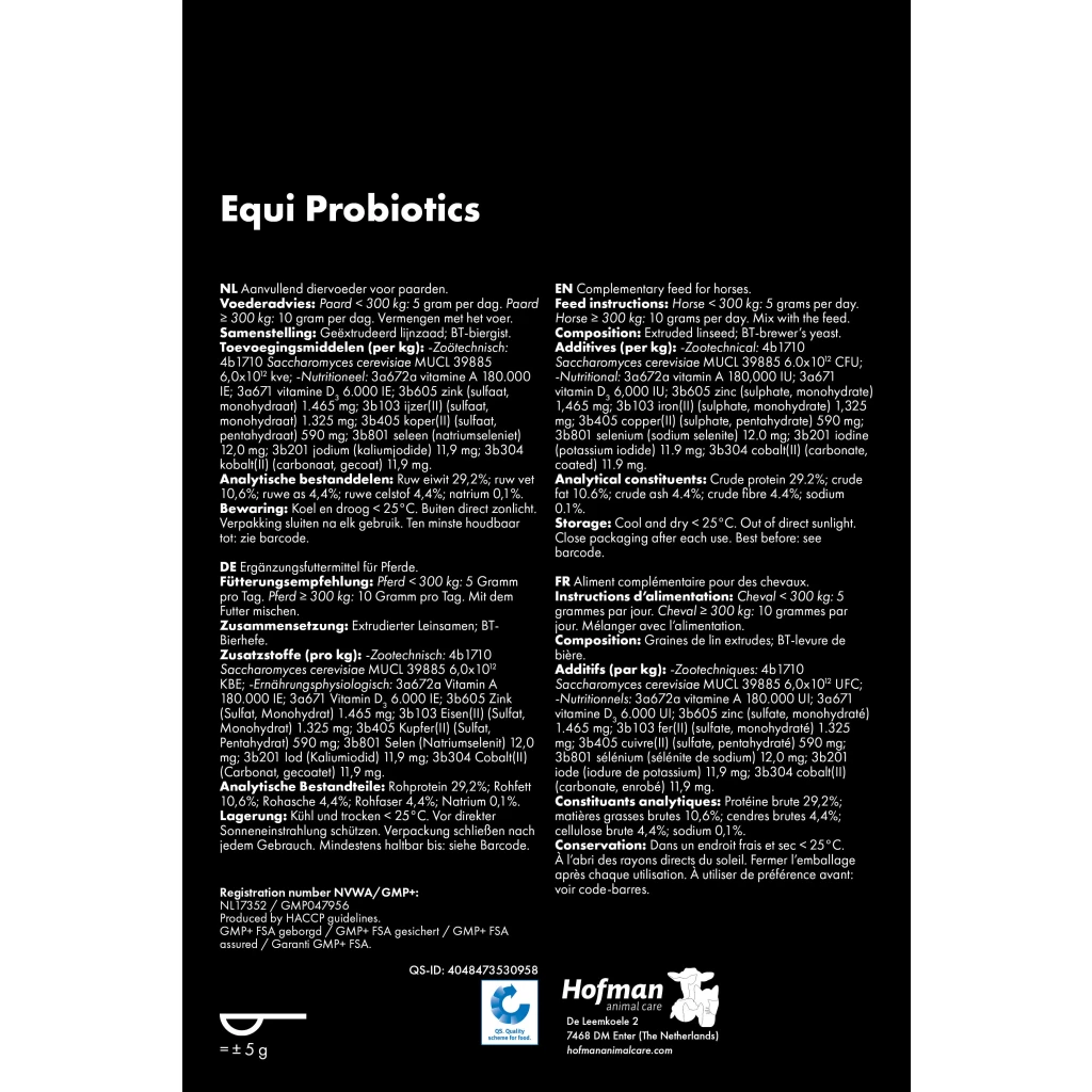 Probiotics contains a combination of probiotics and prebiotics. Probiotics are live microorganisms that have a beneficial effect on digestion and intestinal health. Prebiotics serve as a nutrient for the probiotics. Probiotics contains living BT brewer’s yeast (Saccharomyces cerevisiae) as a probiotic and extruded flaxseed as a prebiotic. This combination promotes intestinal function, is good for a balanced intestinal flora and stimulates digestion.