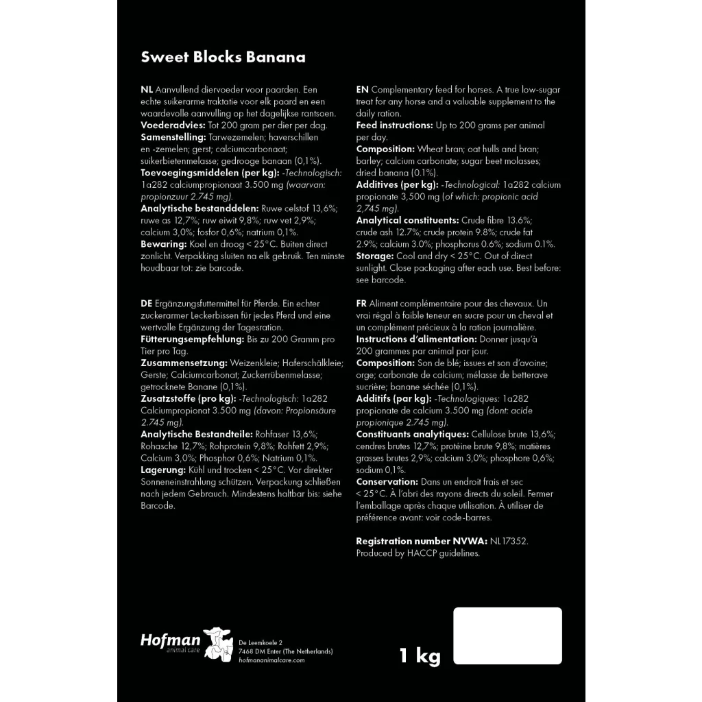 The base of the Sweet Blocks includes wheat bran, oat hulls and barley, grains used in many horse feeds. In addition, these treats contain sugar beet molasses and, depending on the variant chosen, dried apple pomace and apple pieces, dried bananas, dried carrots, garlic or herbs, for a delicious flavour.
