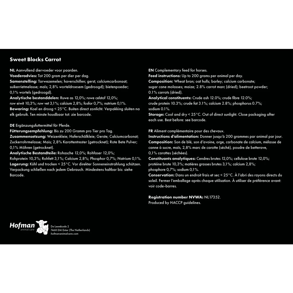 The base of the Sweet Blocks includes wheat bran, oat hulls and barley, grains used in many horse feeds. In addition, these treats contain sugar beet molasses and, depending on the variant chosen, dried apple pomace and apple pieces, dried bananas, dried carrots, garlic or herbs, for a delicious flavour.