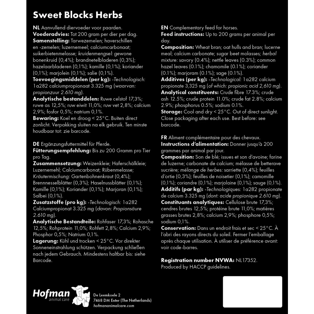 The base of the Sweet Blocks includes wheat bran, oat hulls and barley, grains used in many horse feeds. In addition, these treats contain sugar beet molasses and, depending on the variant chosen, dried apple pomace and apple pieces, dried bananas, dried carrots, garlic or herbs, for a delicious flavour.