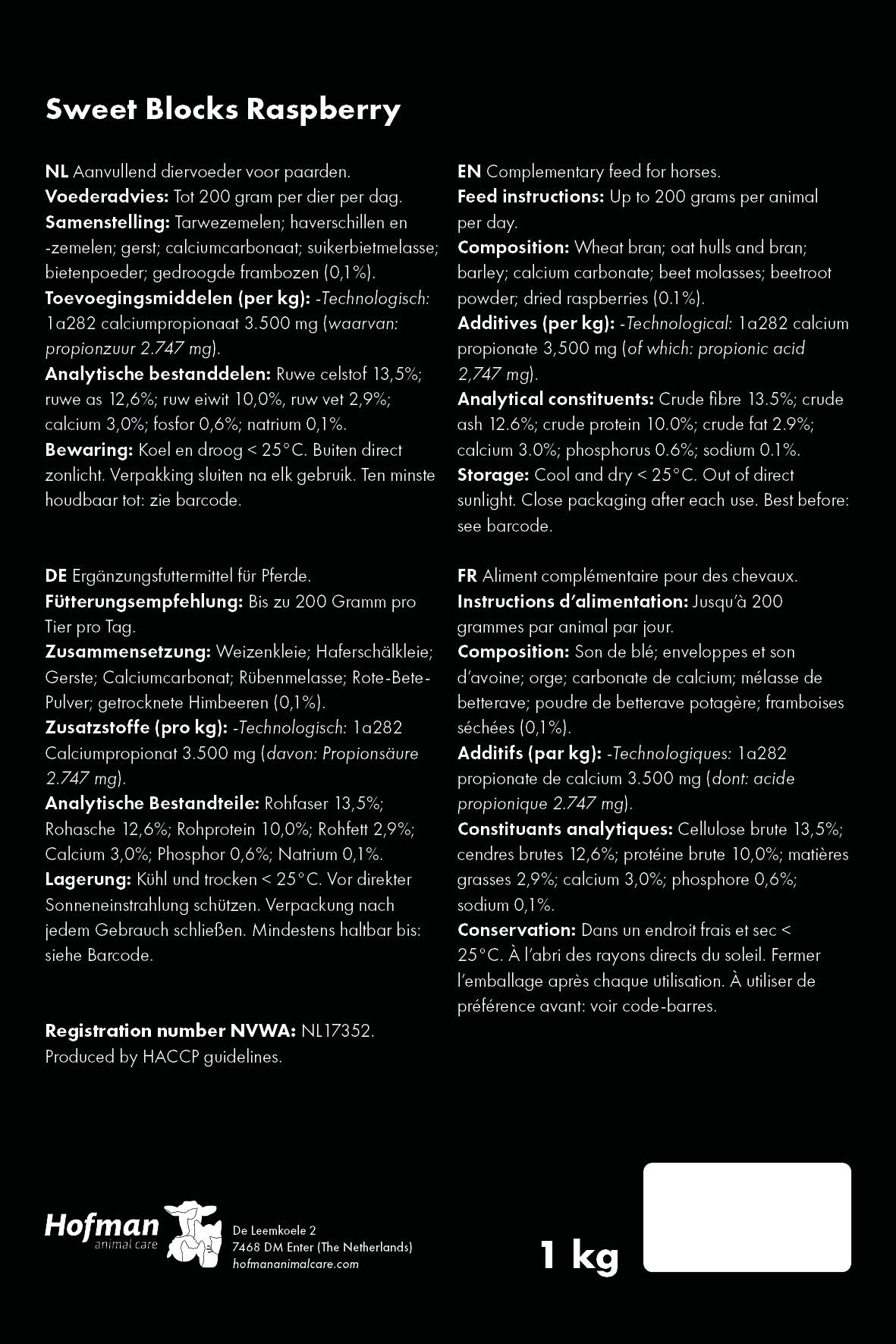 Sweet Blocks Raspberry on maitsev ja madala suhkrusisaldusega preemiana antav täiendsööt hobustele. Need kindlalt pressitud graanulid ei pudene ega kleepu, mistõttu on neid mugav taskus või kotis kaasas kanda. Sweet Blocks maiused sobivad ideaalselt preemiaks, olles samal ajal kerge täiendus hobuse igapäevasele ratsioonile.