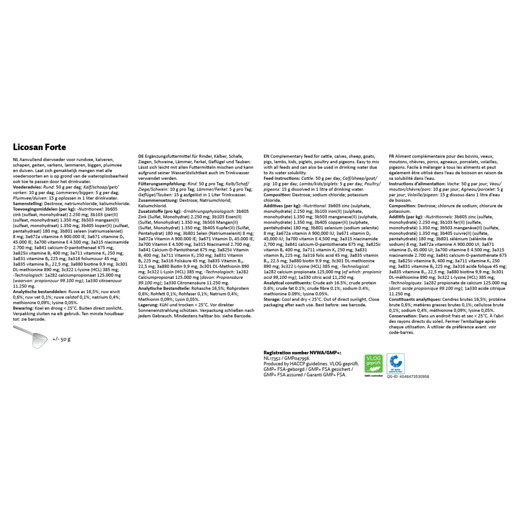 Complementary feed for cattle, calves, sheep, lambs, poultry and pigeons. The complete all-in-one preparation. Easy to mix with all kinds of feed and can also be added to the drinking water due to its water solubility.