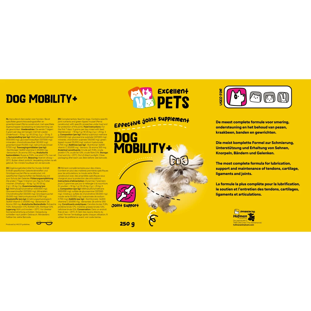 Excellent Pets Dog Mobility+ includes MSM, glucosamine, chondroitin sulphate, green-lipped mussel, hyaluronic acid and vitamin C. MSM (methylsulphonylmethane) is a source of sulphur and supports the joints. Glucosamine and chondroitin sulphate occur naturally in joints, tendons and cartilage. These substances help lubricate and maintain joint flexibility. Green-lipped mussel includes omega 3 fatty acids, vitamins and minerals, with specific properties in stressing and protecting joints. It also contains hyaluronic acid, which is a body’s own lubricant found in joint fluid. It supports joint function and the maintenance of supple joints. Vitamin C is a natural antioxidant that helps protect the body.