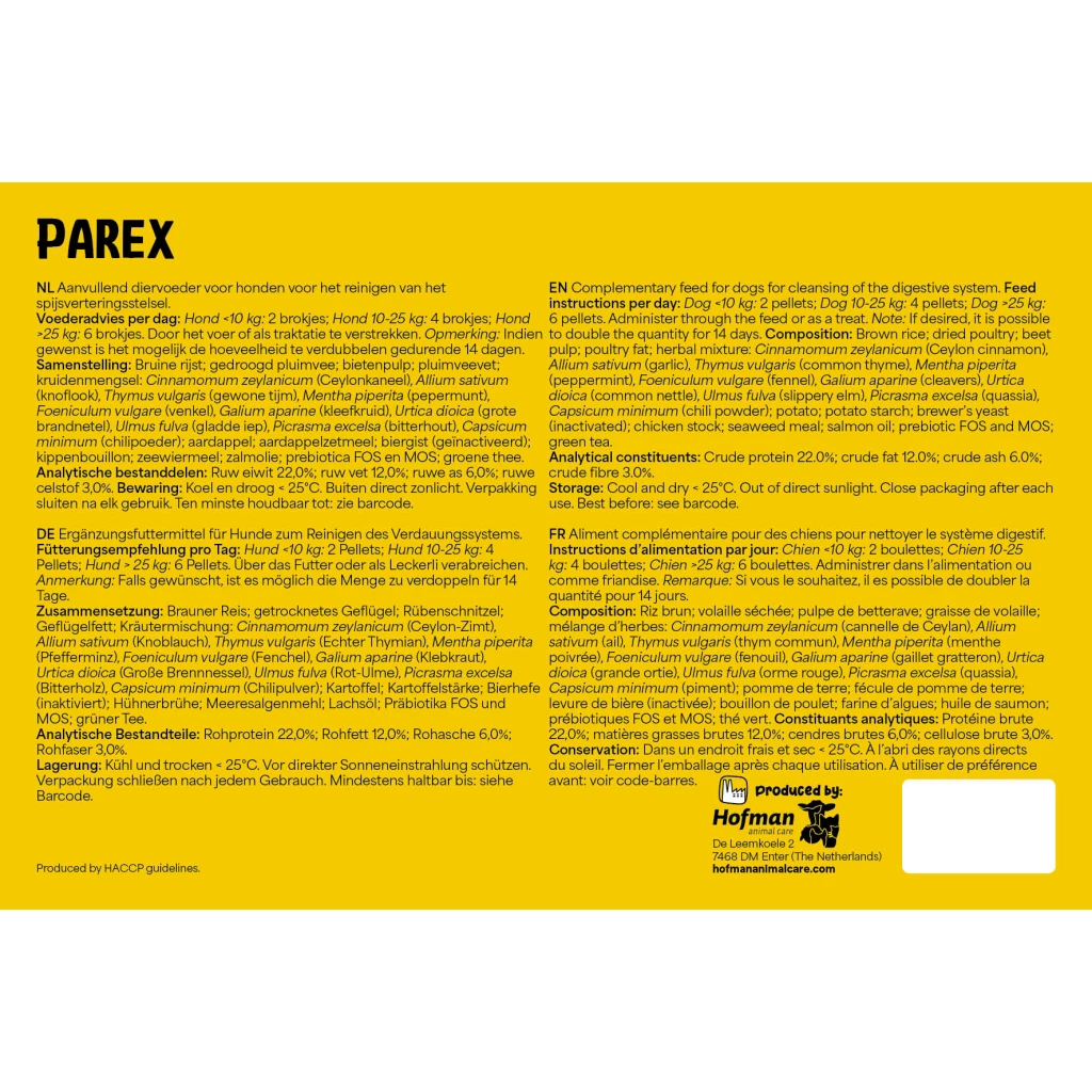 Excellent Pets Dog Parex contains, among others, a mixture of herbs consisting of Ceylon cinnamon, garlic, common thyme, peppermint, fennel, cleavers, large nettle, slippery elm, bitterwood and chilli powder. This mixture helps cleanse the digestive system, activates the immune system and contributes to a shiny coat. In addition, it contains prebiotics in the form of FOS and MOS. FOS (fructo-oligosaccharides) and MOS (mannan-oligosaccharides) are prebiotic fibres that contribute to the growth of good gut bacteria, which is beneficial for maintaining a healthy digestive system. Poultry fat and salmon oil provide a delicious taste.