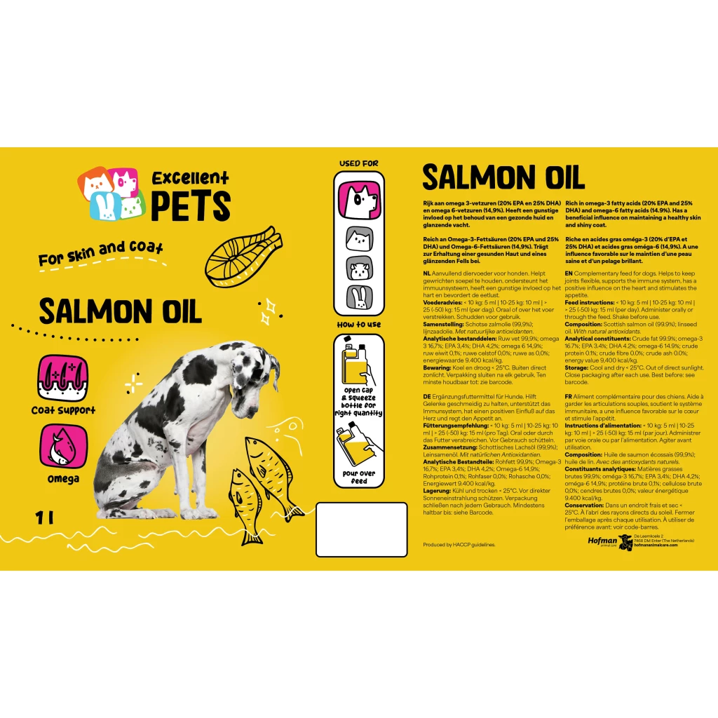 Excellent Pets Salmon Oil is a complementary feed for dogs in liquid form. It helps maintain supple joints, supports the immune system, has a beneficial effect on the heart and promotes appetite.