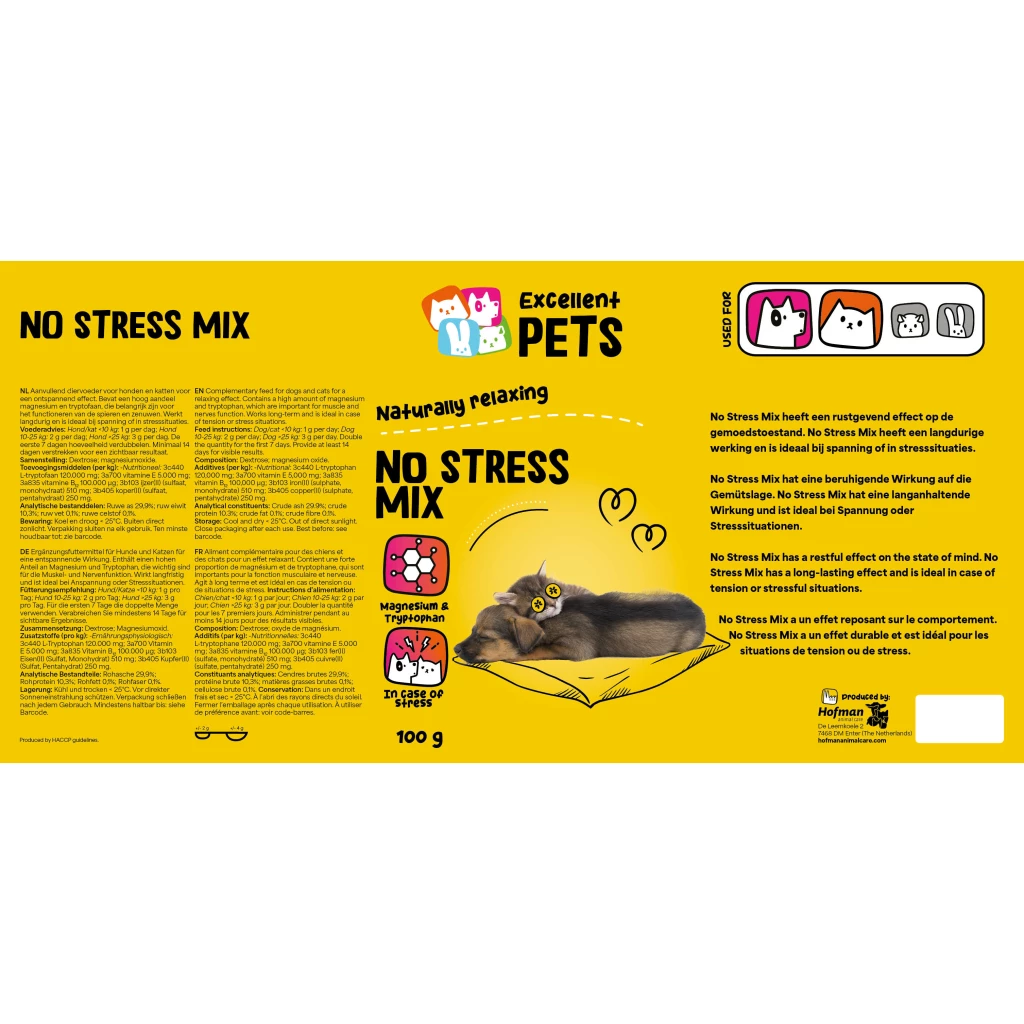 Excellent Pets No Stress Mix contains a high proportion of L-tryptophan and magnesium. L-tryptophan is an essential amino acid, which contributes to the production of serotonin, a substance that provides a sense of calm and well-being. As a result, dogs and cats become calmer in stressful situations. Magnesium has a beneficial effect on the nervous system and muscles and it stimulates relaxation.