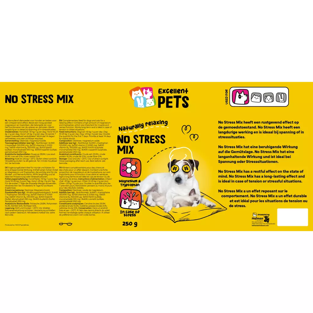 Excellent Pets No Stress Mix contains a high proportion of L-tryptophan and magnesium. L-tryptophan is an essential amino acid, which contributes to the production of serotonin, a substance that provides a sense of calm and well-being. As a result, dogs and cats become calmer in stressful situations. Magnesium has a beneficial effect on the nervous system and muscles and it stimulates relaxation.
