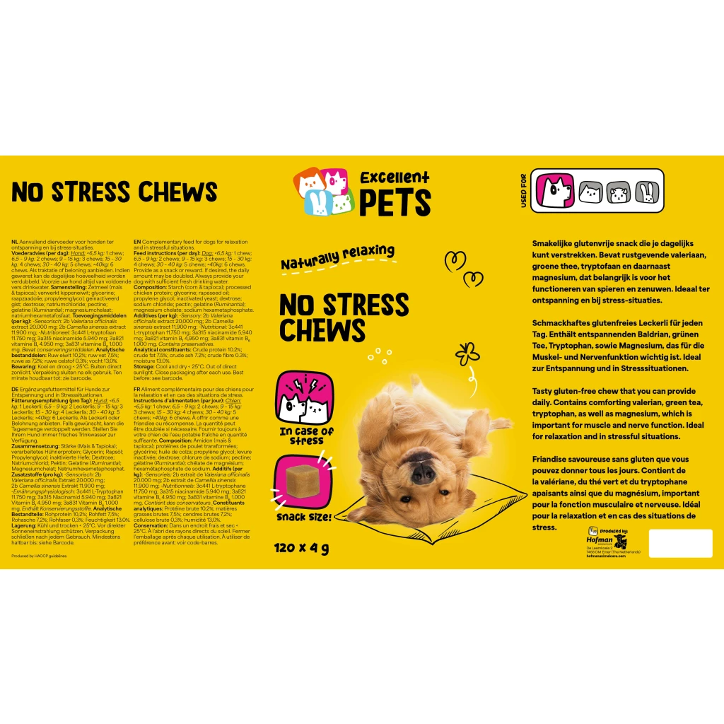 Excellent Pets No Stress Soft Chews includes L-tryptophan, valerian, green tea and magnesium. L-tryptophan is an essential amino acid, which contributes to the production of serotonin, a substance that provides a sense of calm and well-being. As a result, dogs become more relaxed in stressful situations. Magnesium has a beneficial effect on the nervous system and muscles and it stimulates relaxation. Valerian has a relaxing effect and is ideal in case of tension or in stressful situations. Green tea is rich in antioxidants, which help protect the body from harmful influences.
