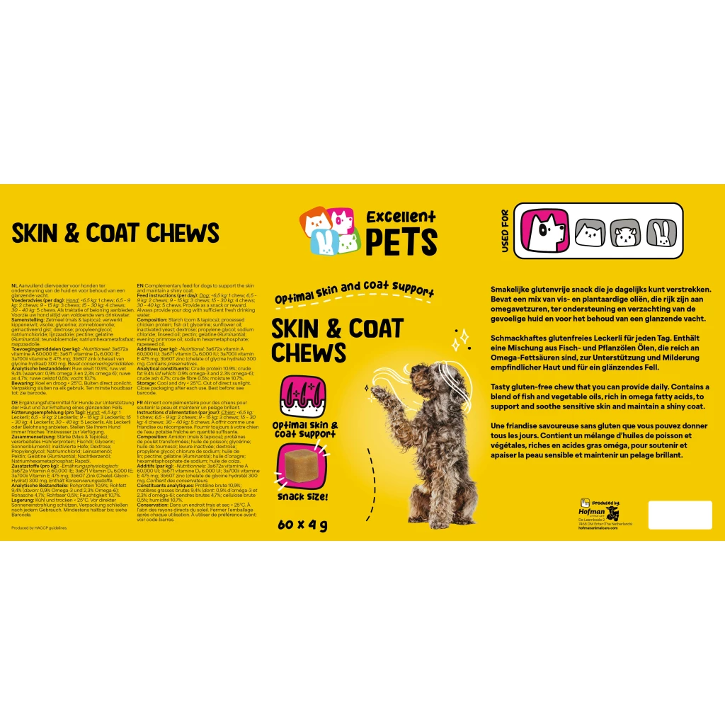 Excellent Pets Skin & Coat Chews is a complementary feed for dogs in the form of soft chews. It is rich in omega fatty acids to support and soothe sensitive skin and maintain a shiny coat.