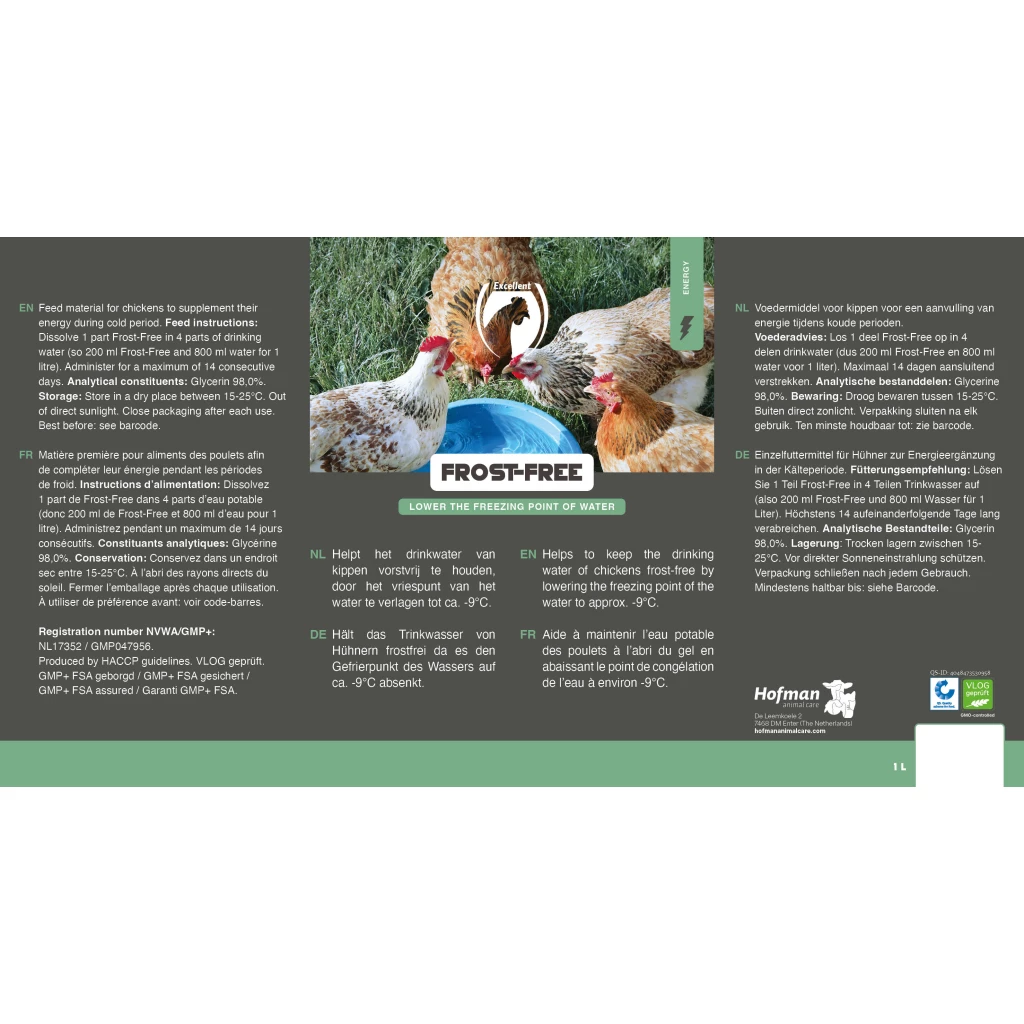 Frost-free for chickens is a feed material for chickens to supplement their energy during cold periods. Frost-free helps to keep chicken drinking water frost-free by lowering the freezing point of the water. This feed material contains glycerine and is easy to use. Dissolve 1 part frost-free in 4 parts drinking water. For one litre of drinking water, use 200 ml Frostproof and 800 ml water. Frost free can be used for up to 14 consecutive days and provides fresh drinking water down to -9 degrees.