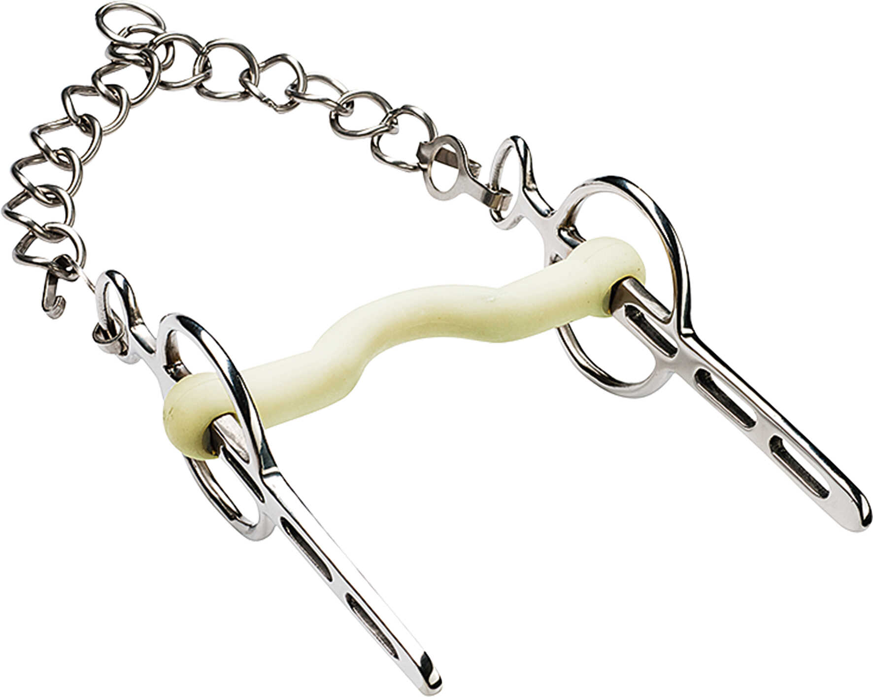 The Flexi mouthpiece has a soft, relaxing apple scent and a tongue-like action. It features three rein loops. Sizes 115 and 125 have two-hole stirrups. Sizes 135 to 165 have longer stirrups with three holes.