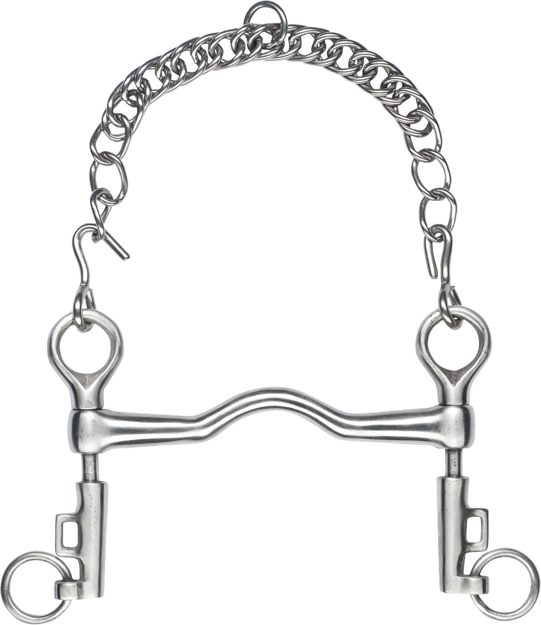 A double-bar bit made of satin-finished stainless steel, with a shank with a slight tongue clearance. The separate mouthpiece and the bit allow the horse to play with the bit.