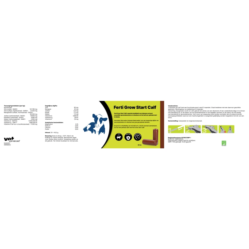 Ferti Grow Start Calf has been specially developed for calves and contains essential trace elements and vitamins to give the calf the best start. The bolus guarantees a daily release of zinc, manganese, iodine, cobalt, selenium and vitamins A, D3 and E and can be used for calves from 3 months of age. This bolus does not contain copper! A variant with copper is also available: FERT0004M. With a duration of 6 months, this bolus is an efficient and cost-effective way to support the growth and resistance of calves.