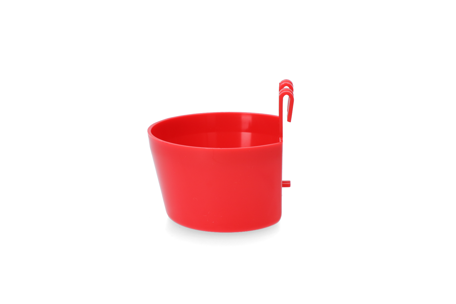 Versatile drinking or feeding cup with 2 hooks. Can be easily hung on various types of mesh.