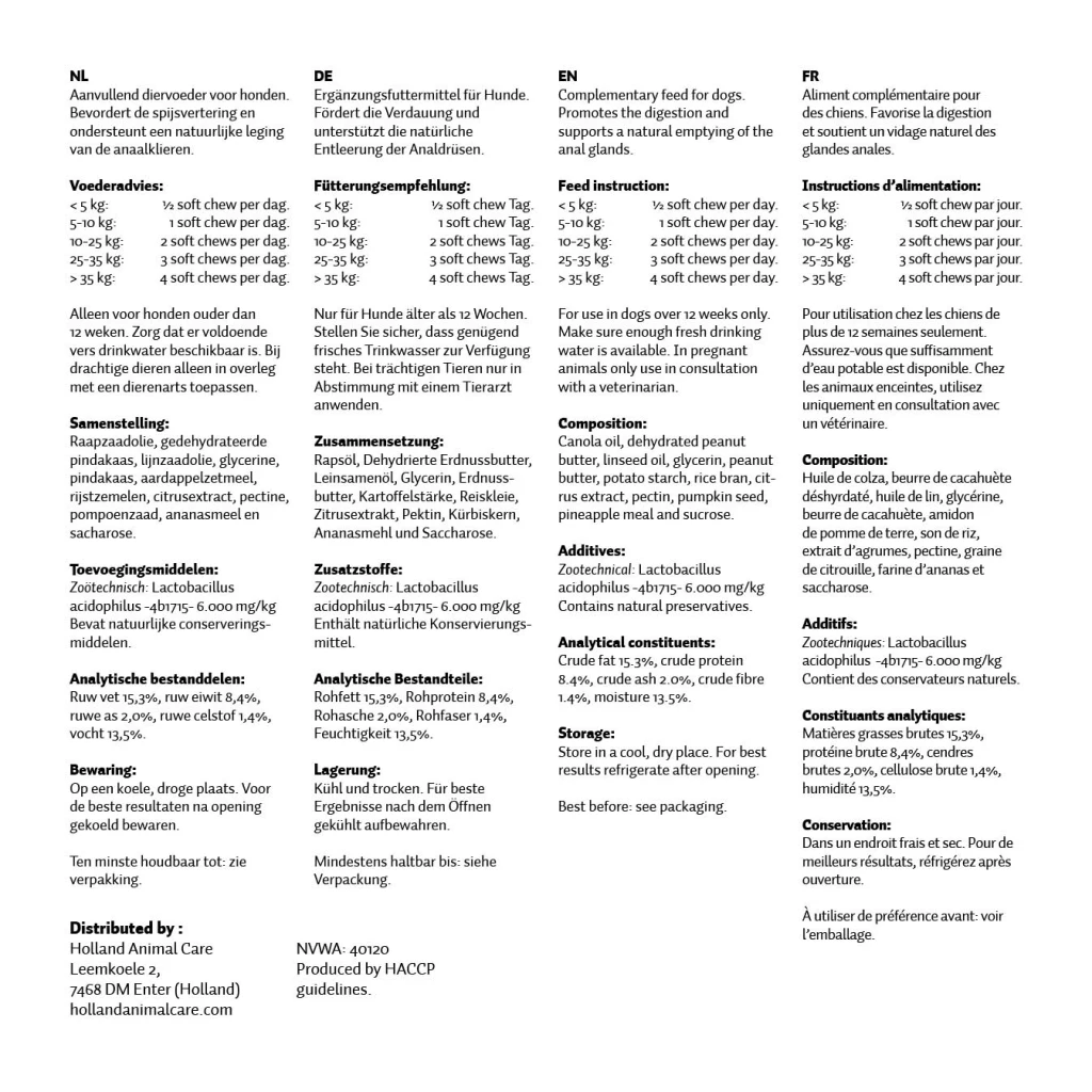 The soft snacks with peanut butter taste and probiotics promotes the digestion and supports a natural emptying of the anal glands.
