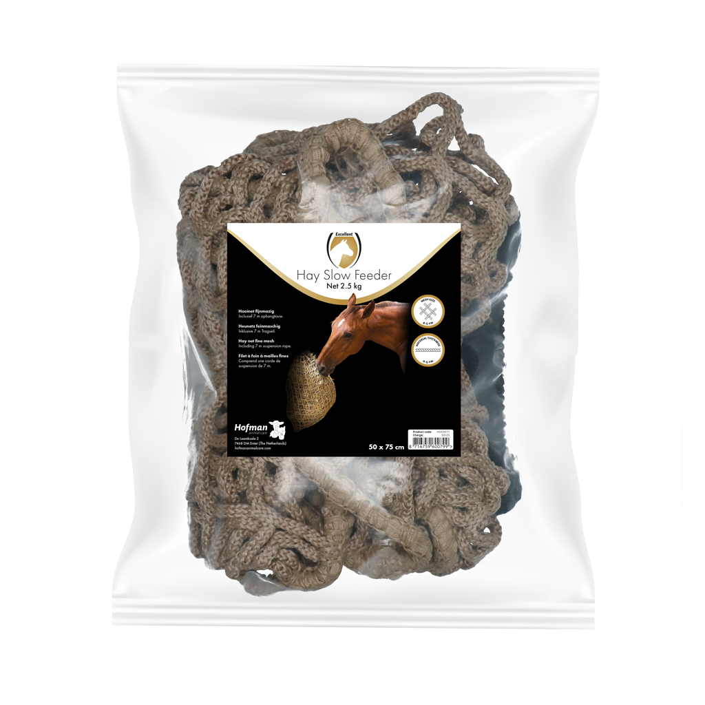 In the wild, horses spend on average twice as much time foraging (searching for food) compared to in a stable. In addition, the horse’s gastrointestinal tract is adapted to constantly eating small bits of roughage such as grass or hay. A slow feeder, such as a hay net, makes the horse eat more slowly and thus mimics a more natural eating behaviour. The constant presence of food has also been shown to give the horse less stress than portion feeding, which is still done at many stables.