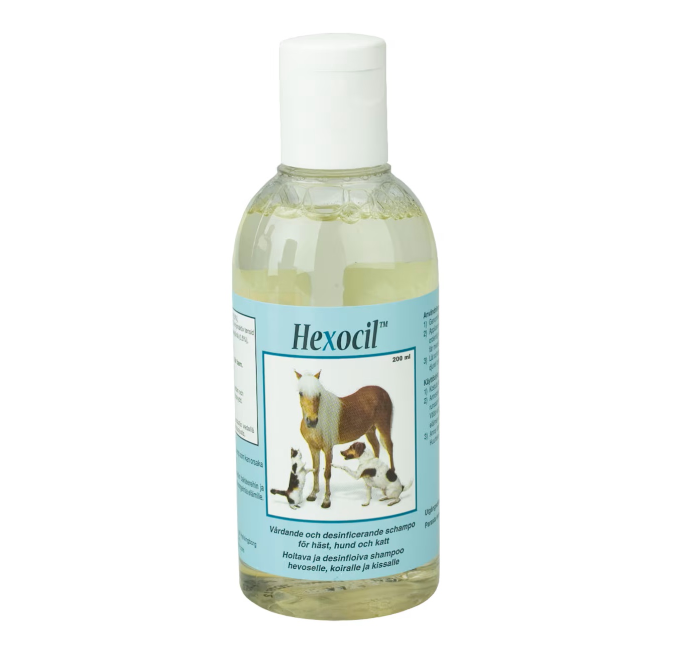 Disinfectant shampoo with nutrients. Can be used on horses, dogs, and cats. Thoroughly cleans the coat, and destroys most bacteria and fungi which may cause rash, dandruff, or other skin problems for animals.
