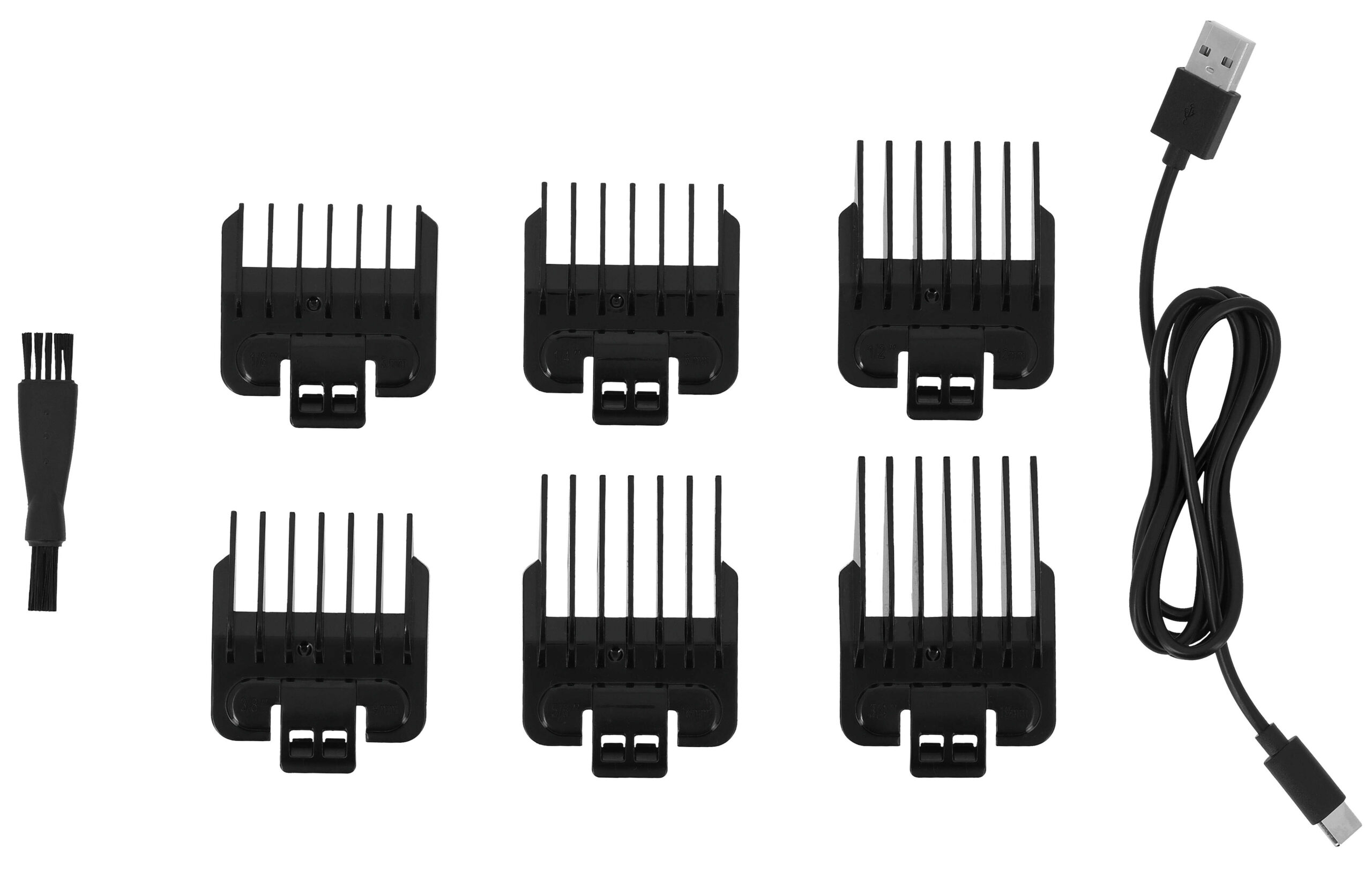 Delivered in a box with: 4 guide combs (3, 6, 10, 13 mm), fine oil, cleaning brush, USB cable.