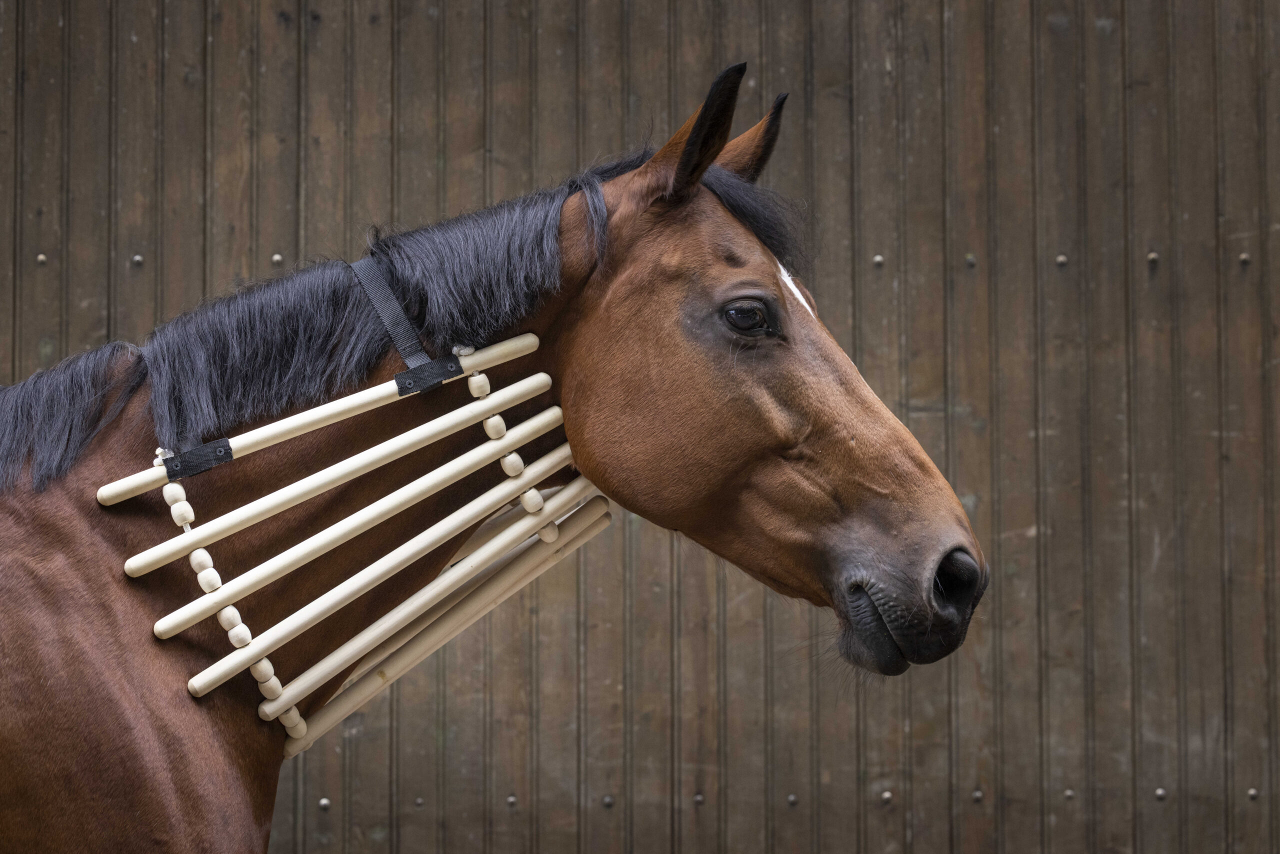 – Fastened with two buckles and adjusted to the horse’s neck.