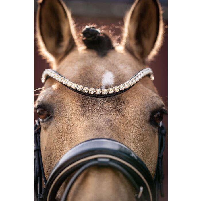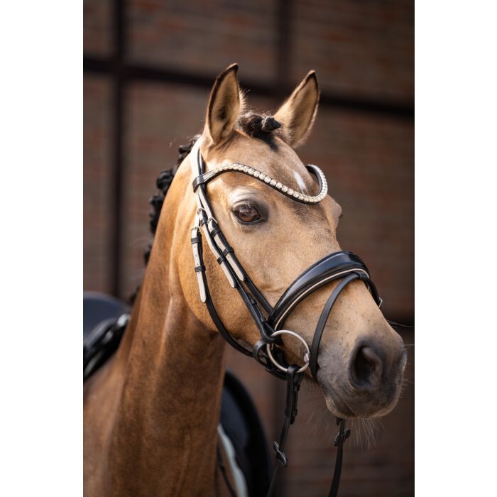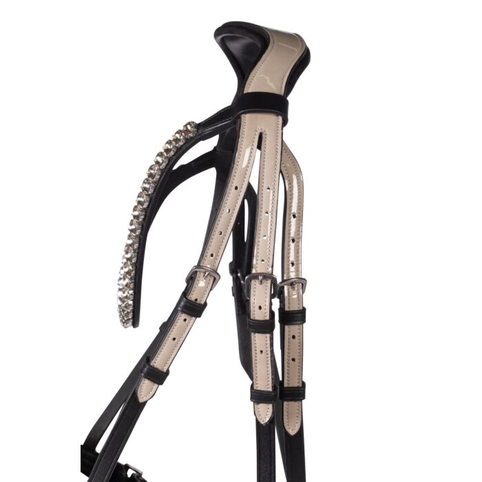 Elegantsed ja silmapaistvad valjad, mis ühendavad kvaliteetse naha, lakknaha detailid ja sädelevate kivikestega otsmikurihma.