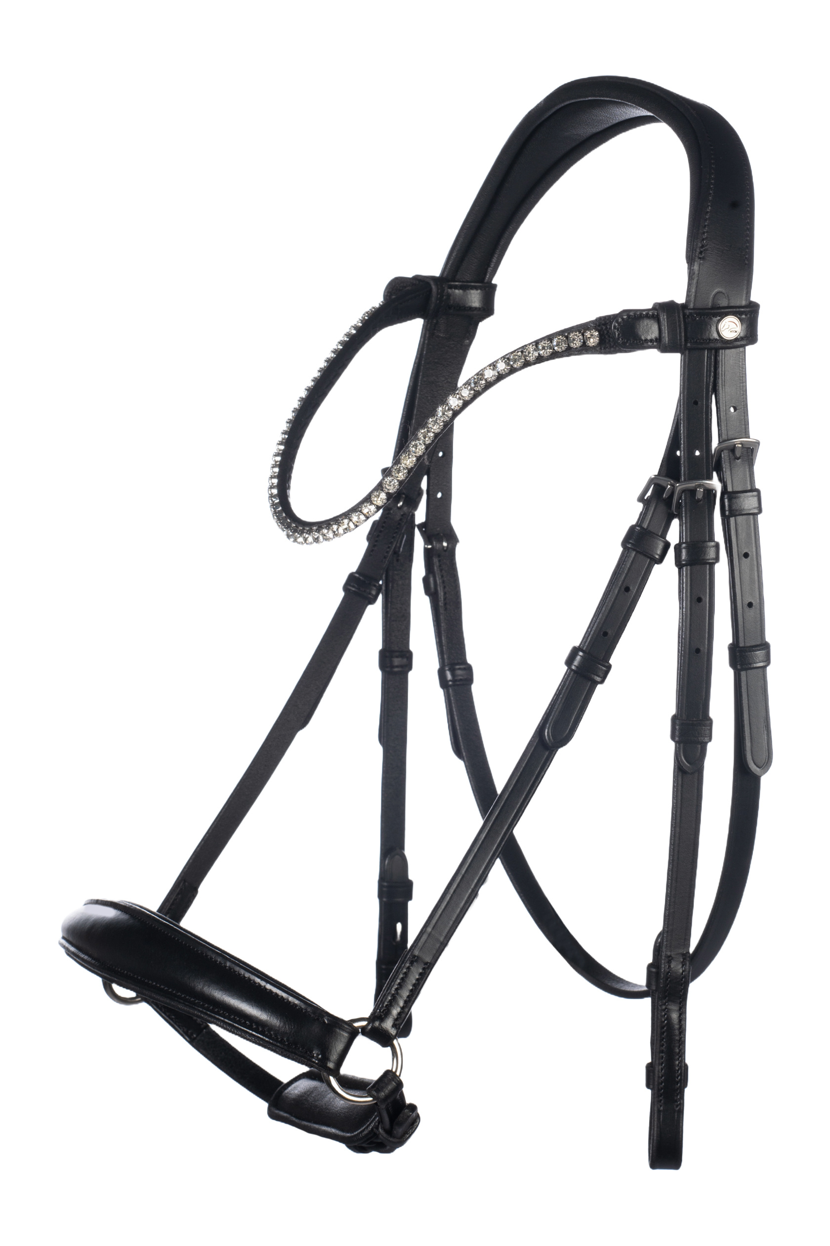calf leather strong silver coloured fittings|drop noseband|padded noseband|with hooks|padded headpiece|browband with rhinestones|soft chin pad|reins made from woven straps with leather stoppers|conical noseband|curved browband|browband easily removable with snap fastener