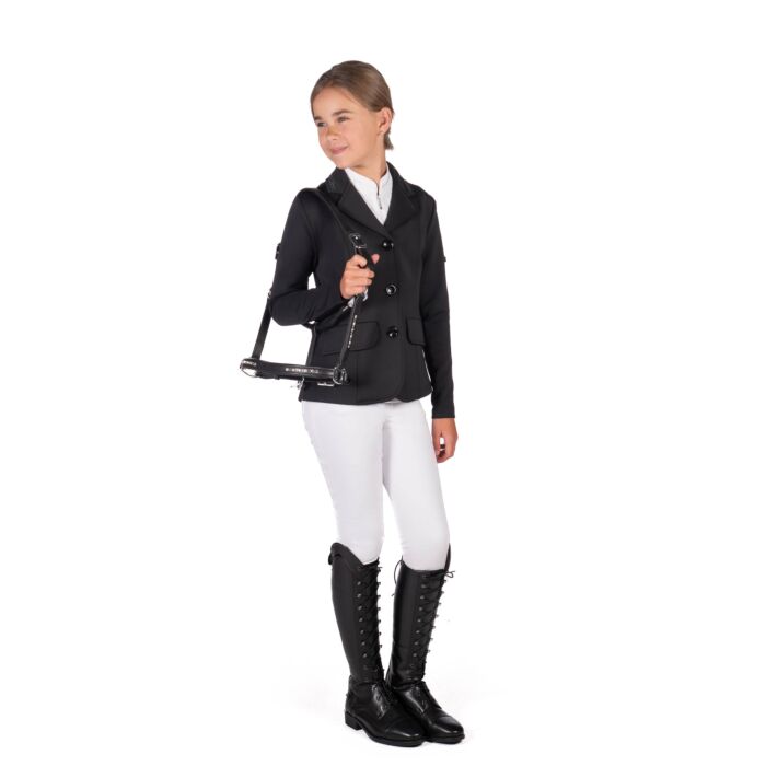 Elegantne ja mugav võistluspintsak lastele, mis ühendab klassikalise välimuse, veniva materjali ja praktilised detailid, tagades suurepärase istuvuse nii treeningul kui ka võistlustel.