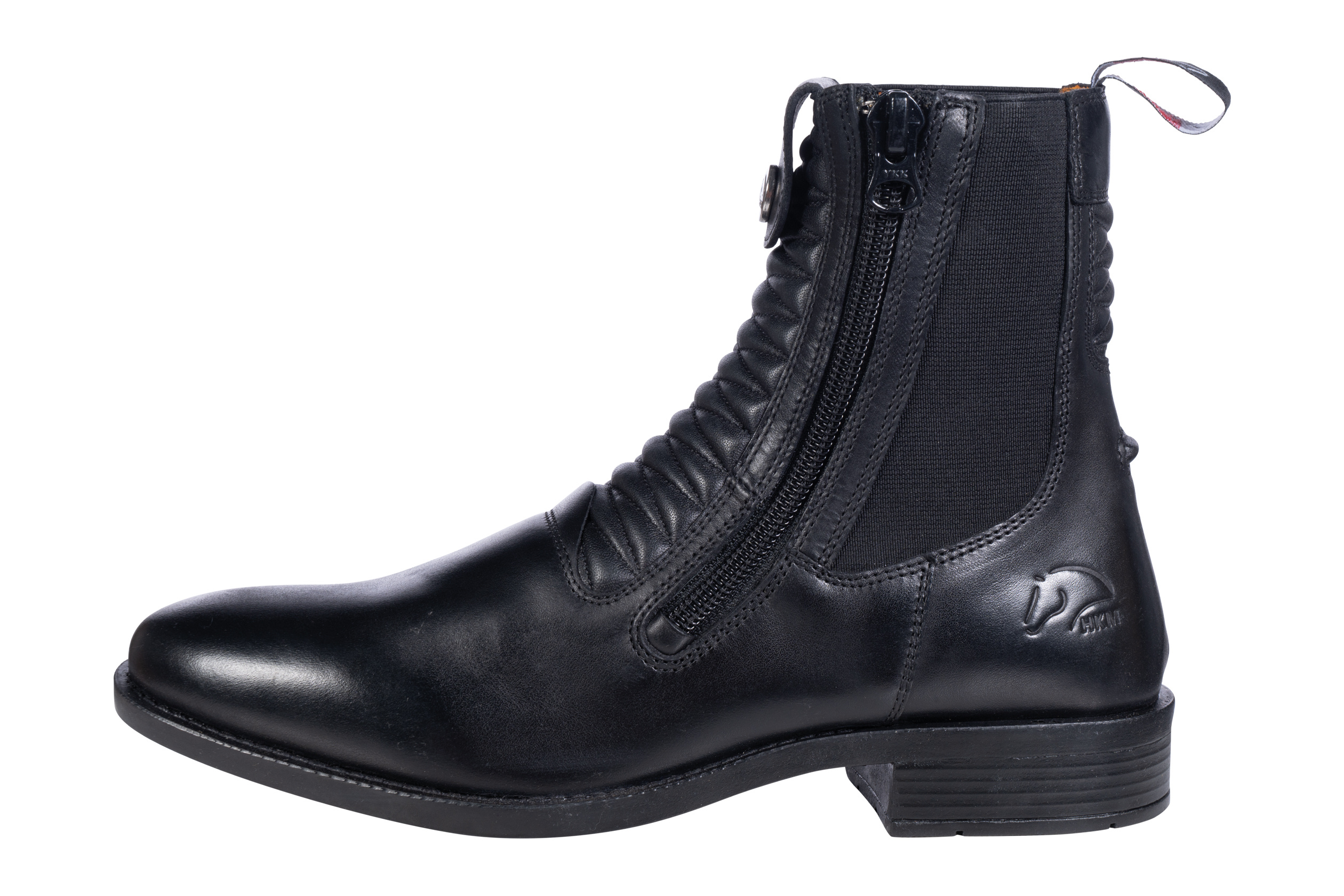synthetic sole quality leather|light leather lining elasticated insert|spur support|inner sole with memory foam|cross stitching on the front and back, underlaid with light padding|HKM logo embossing|pull-on aid|high quality side zip for comfortable entry|tongue with press stud for chaps
