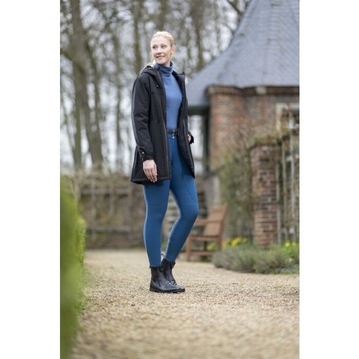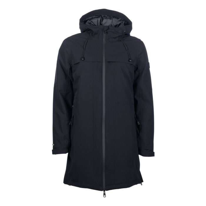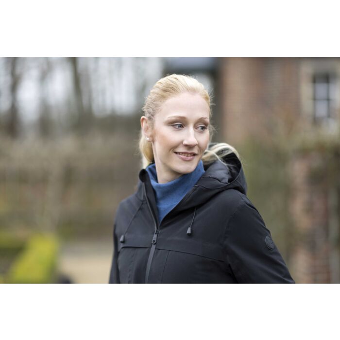 Hillary ratsamantel on valmistatud veekindlast membraankangast (veepidavus kuni 3000 mm), mis hoiab sind kuivana ka vihmasel päeval. Mantlil on lihtne, kuid modernne lõige koos praktiliste detailidega: eemaldamatu kapuuts reguleeritava servaga, kahesuunaline esilukk tuuleklapiga ning pikad ratsutamislõhikud külgedel, mille alumisel osal on volditud helkiv trükiviimistlus parema nähtavuse tagamiseks.