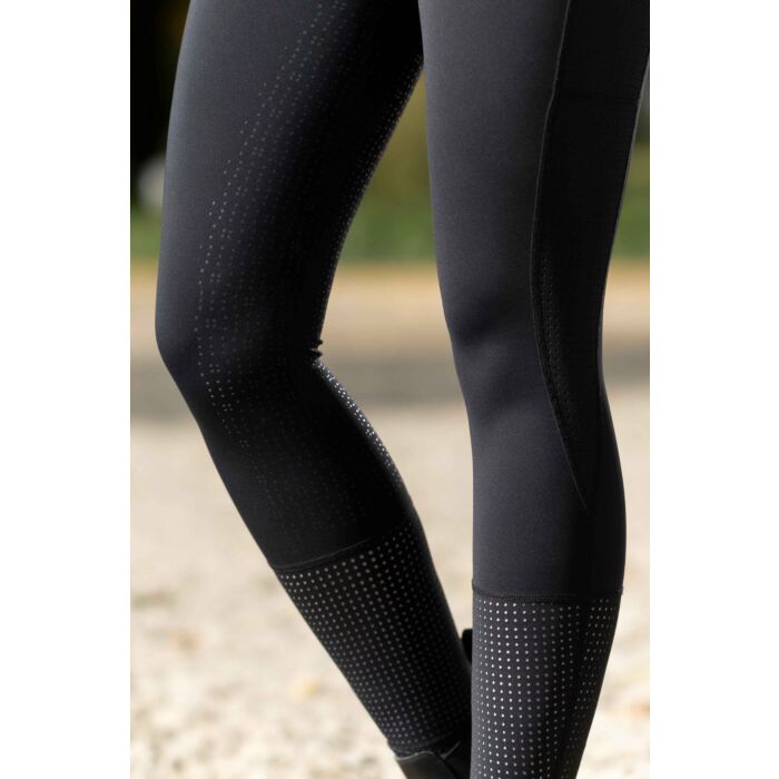 The riding leggings Juna with silicone full seat offer optimum support in the saddle and combine functionality with an elegant design. The breathable, bi-elastic material ensures a comfortable fit, while the laser-cut design inserts offer additional air permeability. Belt loops, a side mobile phone pocket and two side slit pockets make these leggings practical and suitable for everyday wear. The stylish overall look is rounded off with a high-quality metallic appliqué.