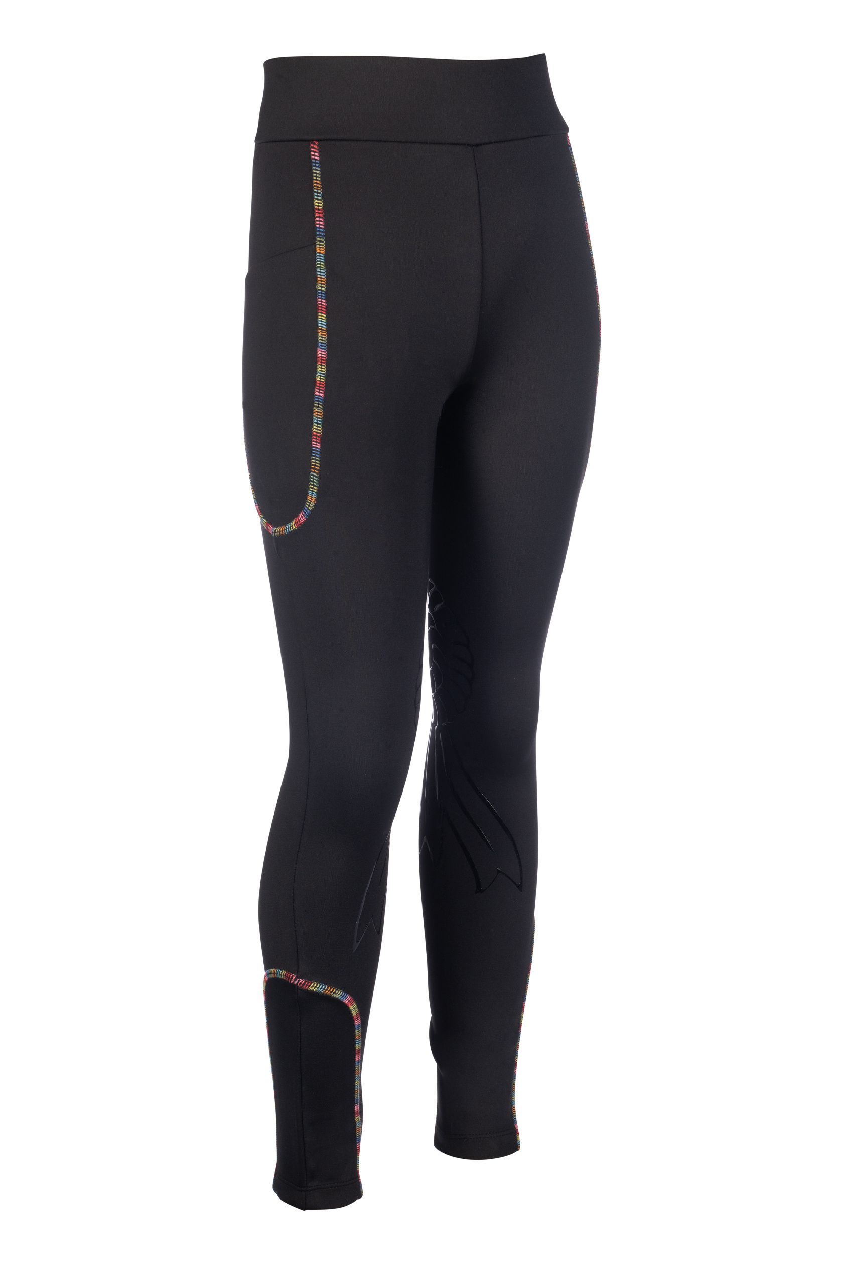 machine washable at 30 degrees 80% nylon, 20% elastane 4-way stretch material lateral mobile phone pocket|silicone knee patch|multicolour seams|horse motif print children sizes up to size 128 with adjustable waistband