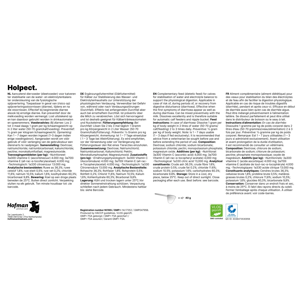 2 to 3 times daily, dissolve 1 g Holpect per kg LG in 2 l water (50-70 g/calf/food).