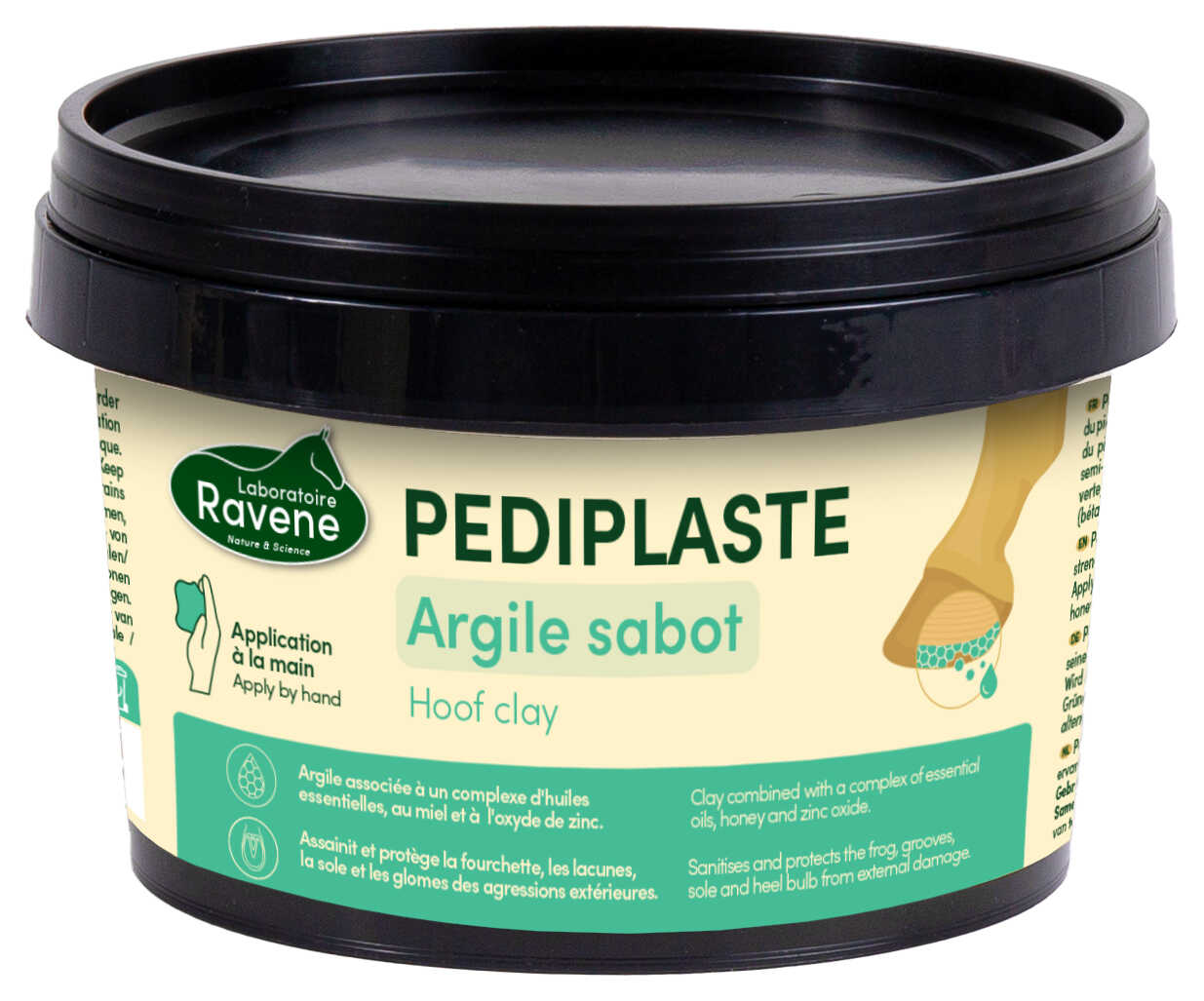 The perfect clay for protecting and strengthening hoof horn. Cleanses and strengthens the hoof: The absorbent properties of the clay contribute to cleansing the sole of the hoof. – Simple and pleasant application: Thick texture that is easy to apply. DETAILS: – Excellent adhesion. – Ideal for insulating the sole of the hoof, even in damp conditions. – The combination of honey, zinc oxide, and a complex of essential oils strengthens the hoof horn. USAGE TIPS: – Alternate the application of Pediplaste with Pedicade depending on the condition of the hoof horn. It is also possible to apply a layer of Pediplaste after applying Pedicade in the frog grooves and on the frog. – Pediplaste is applied by hand in a medium-thick layer to the sole of the hoof, once or several times a week. COMPOSITION: Green clay, thyme honey, ethoxylated castor oil, zinc oxide, turpentine oil (beta-pinene), tea tree oil (Melaleuca alternifolia).