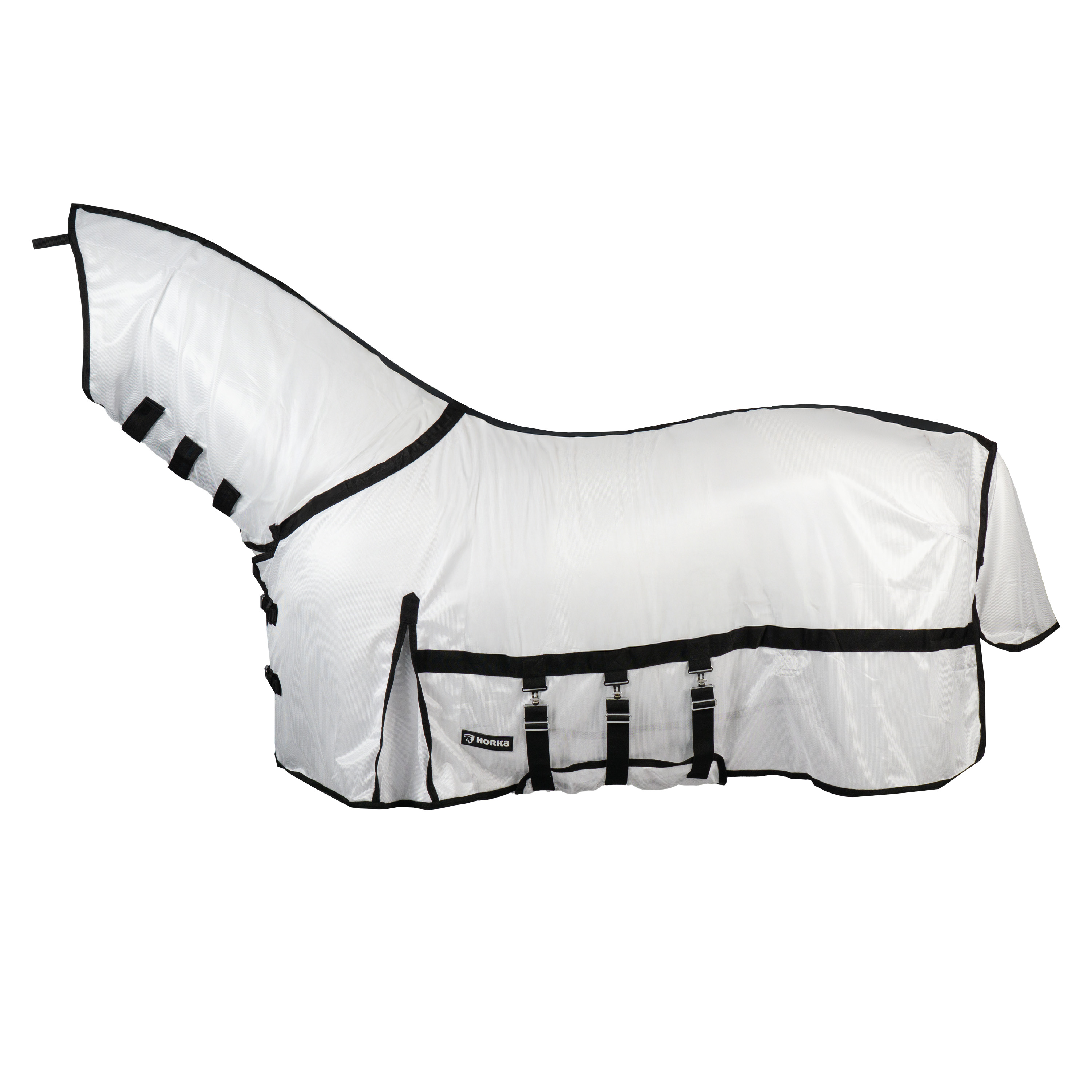 Anti-fly rug with neck in fine mesh fabric. Product specifications: Double buckle closure at the front with Velcro Removable leg straps Spacious tail flap Chest, tail flap and neck section are nylon-lined to prevent chafing Belly protector with 3 elastic straps