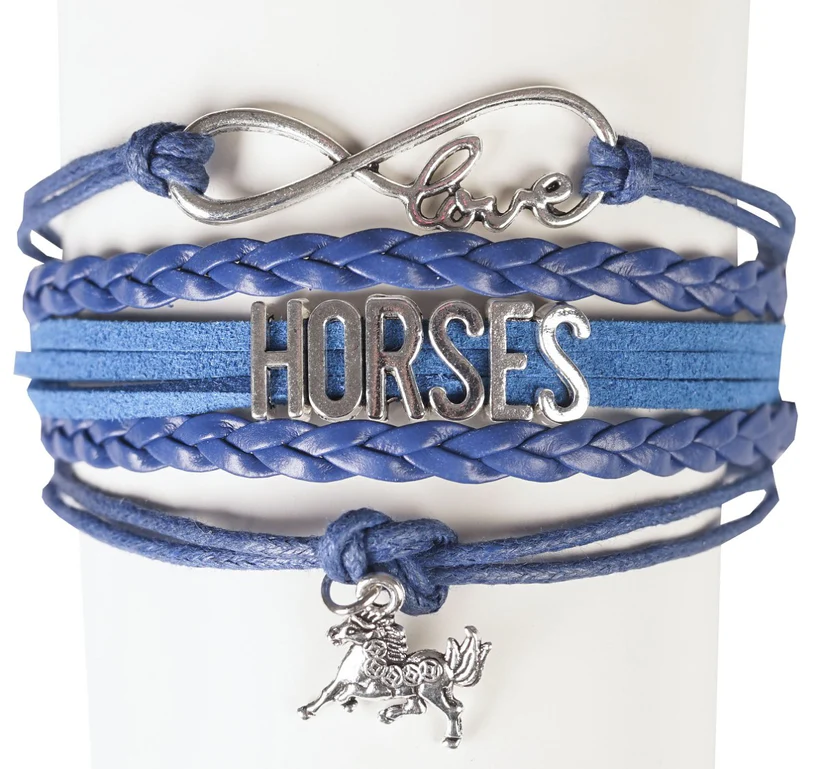 Leather bracelet with an infinity symbol, a horse charm, and the word “Love.”