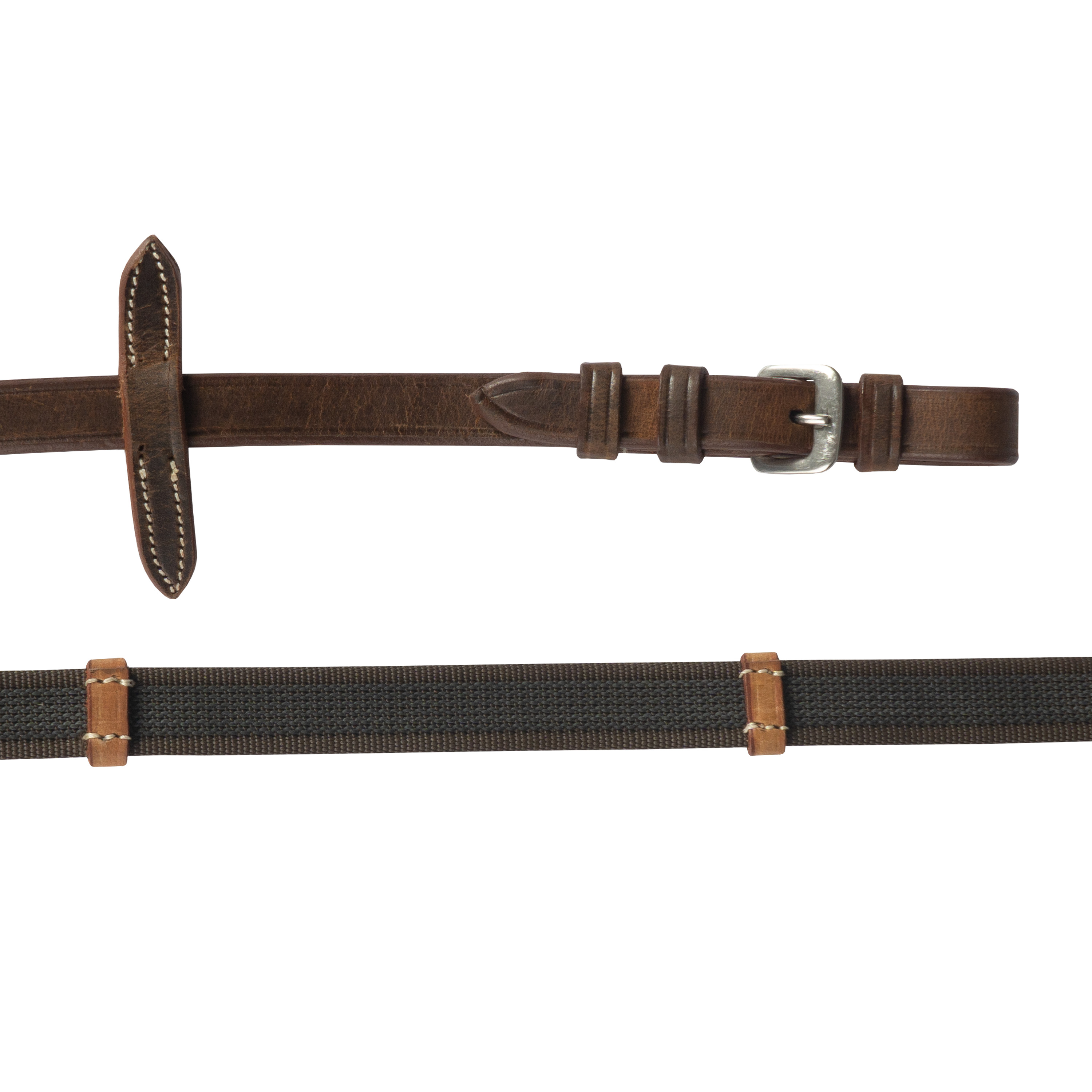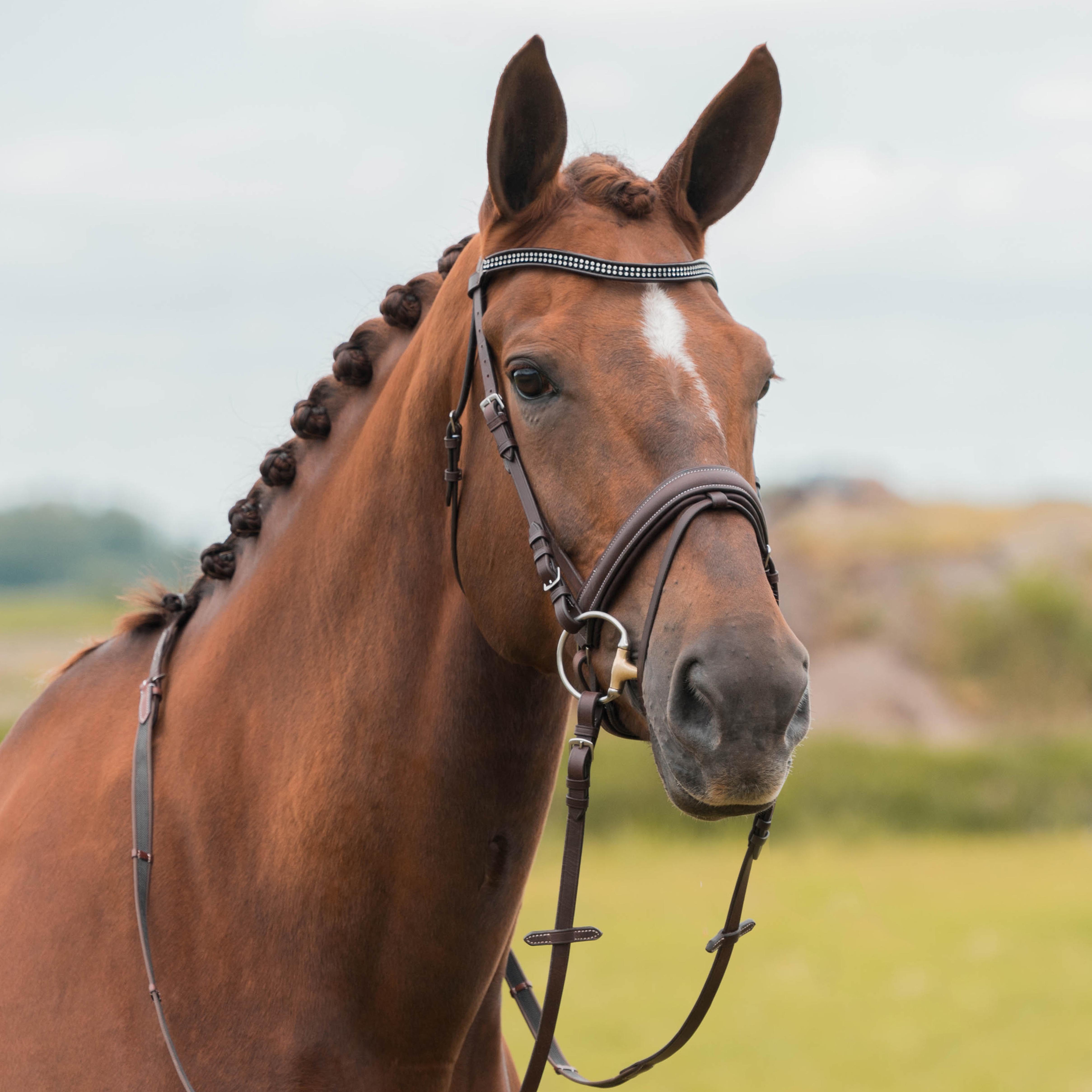 The Nikki bridle, made of beautiful brown leather, features a lowered browband with a double row of diamonds. Product specifications: English noseband with white stitching and a flash strap. The noseband goes over the headpiece. Soft padding in the noseband and headpiece. Includes non-slip reins with stoppers.