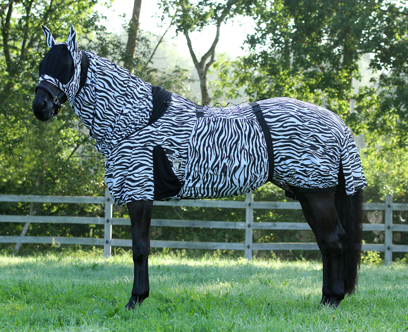 An eczema blanket offers complete protection against sun flies and other insects. Product specifications: UV resistant Fixed neck with lycra insert for extra stretch Lycra insert on the shoulder for extra comfort and freedom of movement: : The blanket is one piece and is pulled over the head Wide removable belly protector The blanket is attached to the belly protector between the front legs with clips: Long wide tail flap Elastic closure per hind leg Especially for horses with eczema complaints: : Eczema fly mask 180166 available separately
