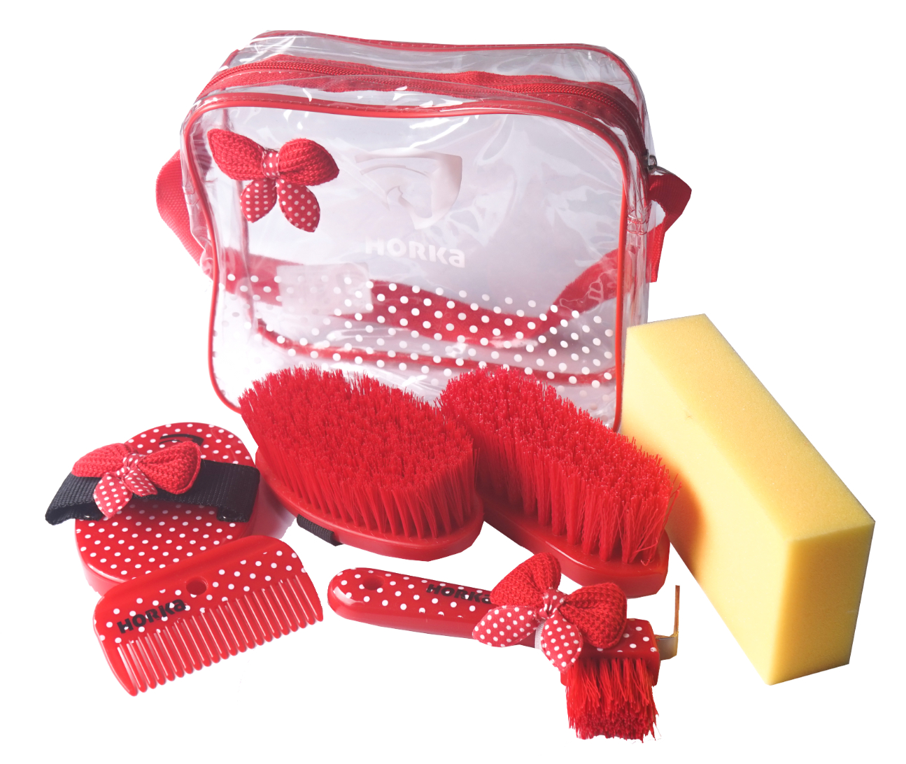 6-piece grooming bag with bow decoration. Contents: Sponge, Short-hair brush, Long-hair brush, Curly brush, Hoof pick, Mane comb. Dimensions: Length: 22 cm, Width: 6 cm, Height: 18 cm.