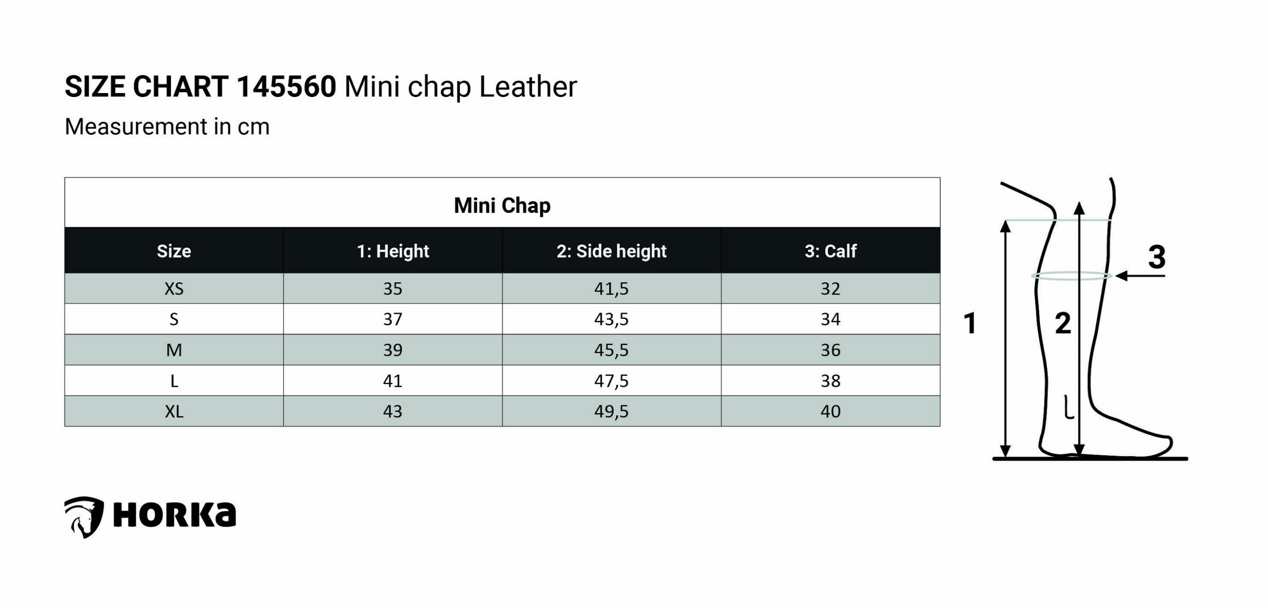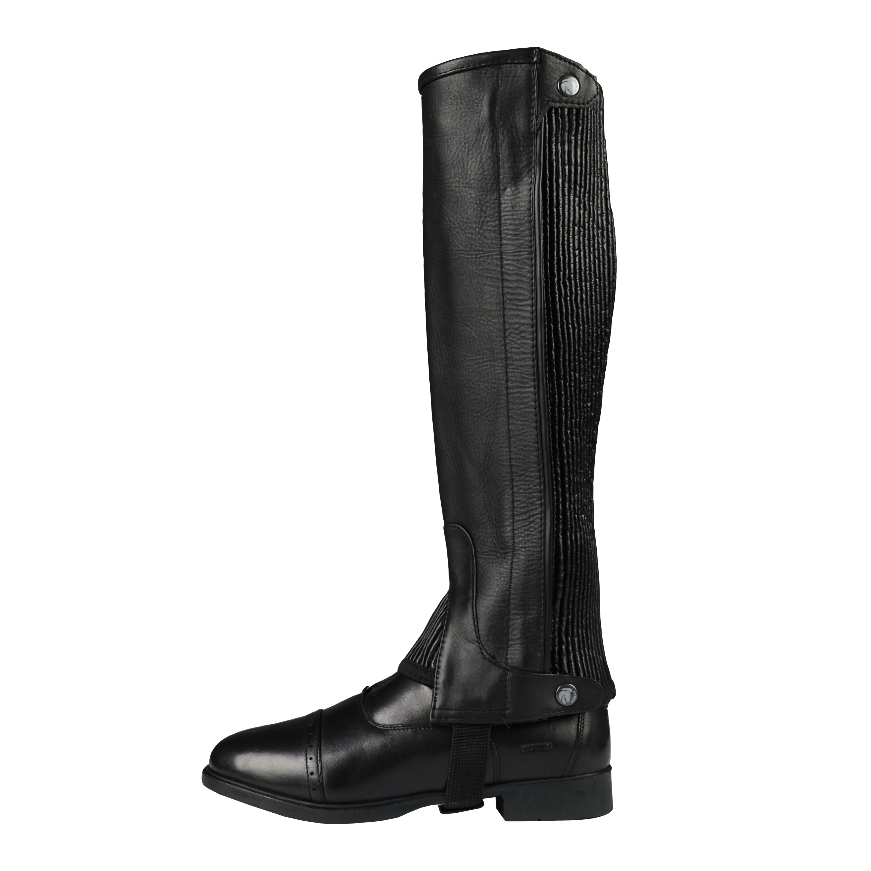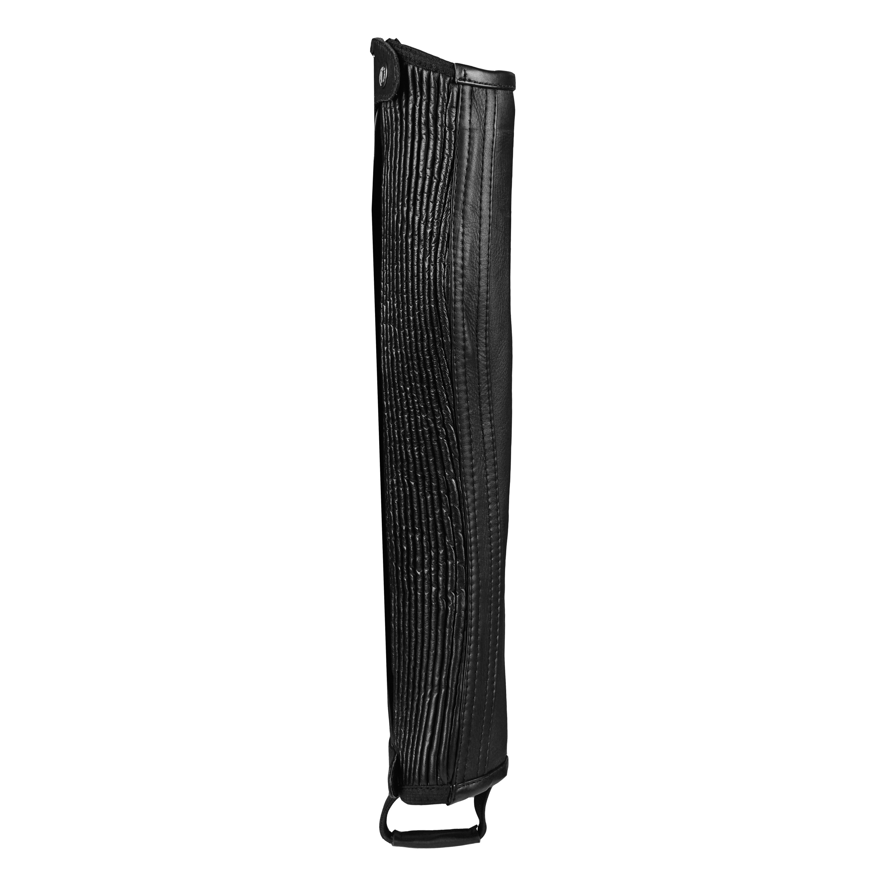 Basic leather chaps with an elasticated insert on the calf and instep for an optimal fit. The zipper closes from top to bottom and has a zipper protector with snap closures at the top and bottom. Product specifications: Leather chaps. Elasticated insert on the calf and instep.