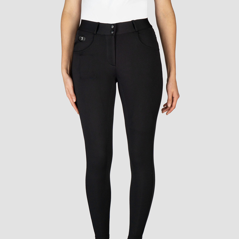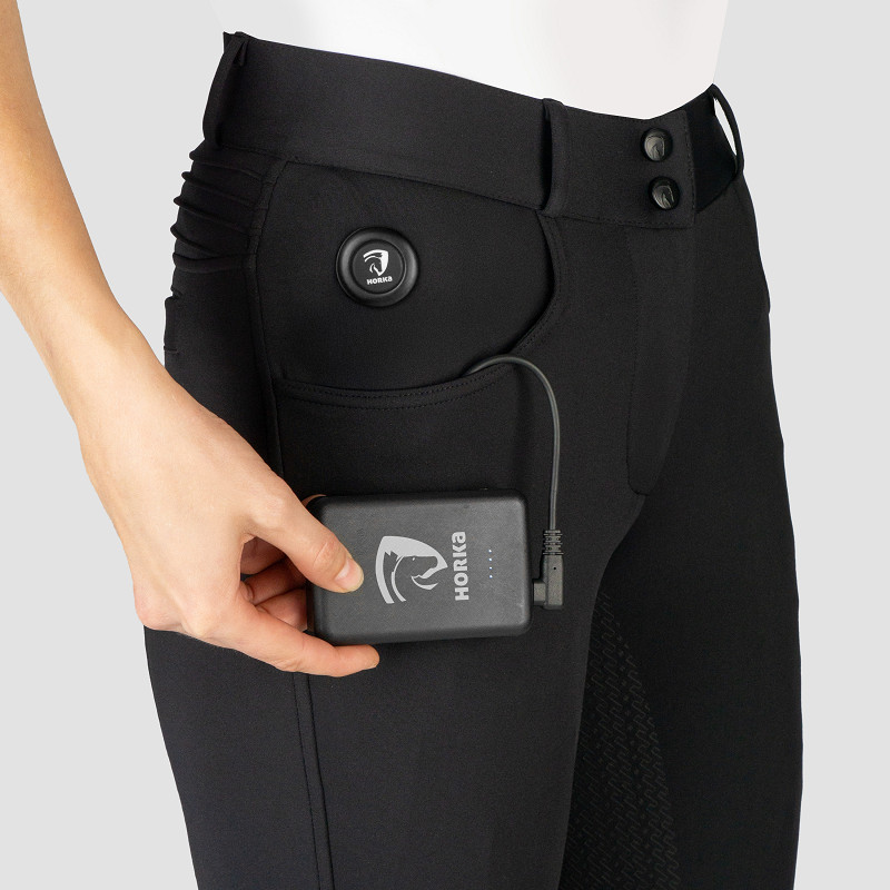 Heated riding breeches with full silicone seat. With the switch-on button, three heating elements can be activated: two on the right and left thighs, and one on the lower back. Fully compliant with EU regulations and certified with the CE mark.