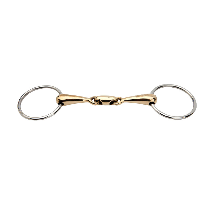 Double jointed snaffle 18 mm with elliptical link. Also available in small sizes suitable for Shetland ponies. Product specifications: Hollow Thickness: 18 mm Ring: 55 mm (85 95 105 115 cm) Ring: 65 mm (125 135 145 155 cm) Gold Brass Gold Brass: 86/90% copper 8/12% aluminum and 3% iron. Guaranteed nickel- and zinc-free.