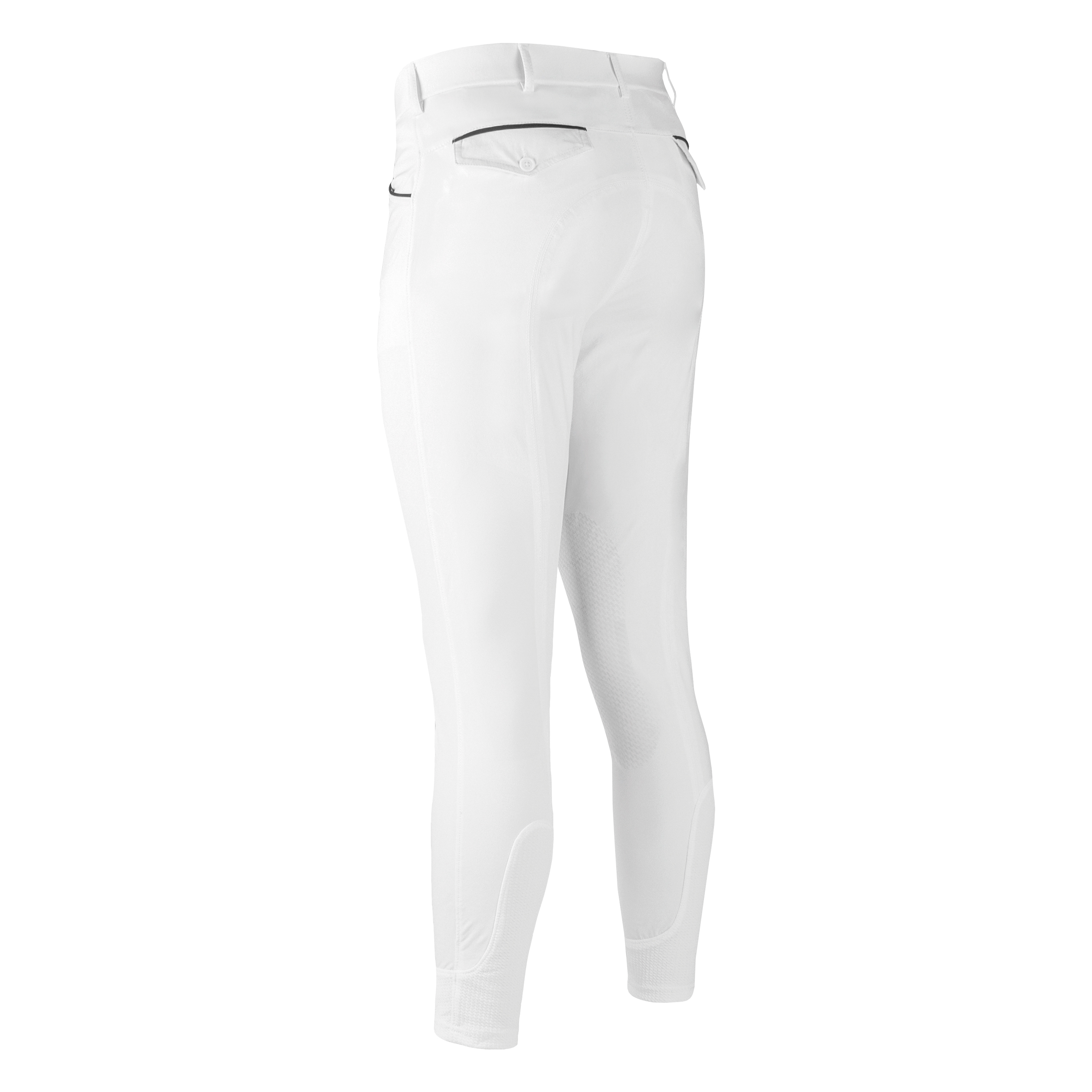 Exclusive high-end men’s riding breeches made of highly technical fabric with two front and back pockets. These breeches feature mesh ankle socks and matte silicone knee patches. Product specifications: Two slanted front pockets Two back pockets with snaps Mesh ankle socks Contrasting piping on pockets Light matte silicone printed knee patches Material: 90% micro nylon 10% spandex