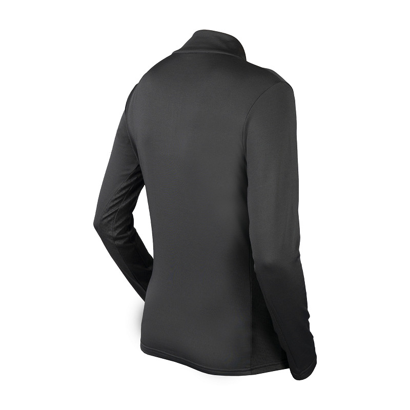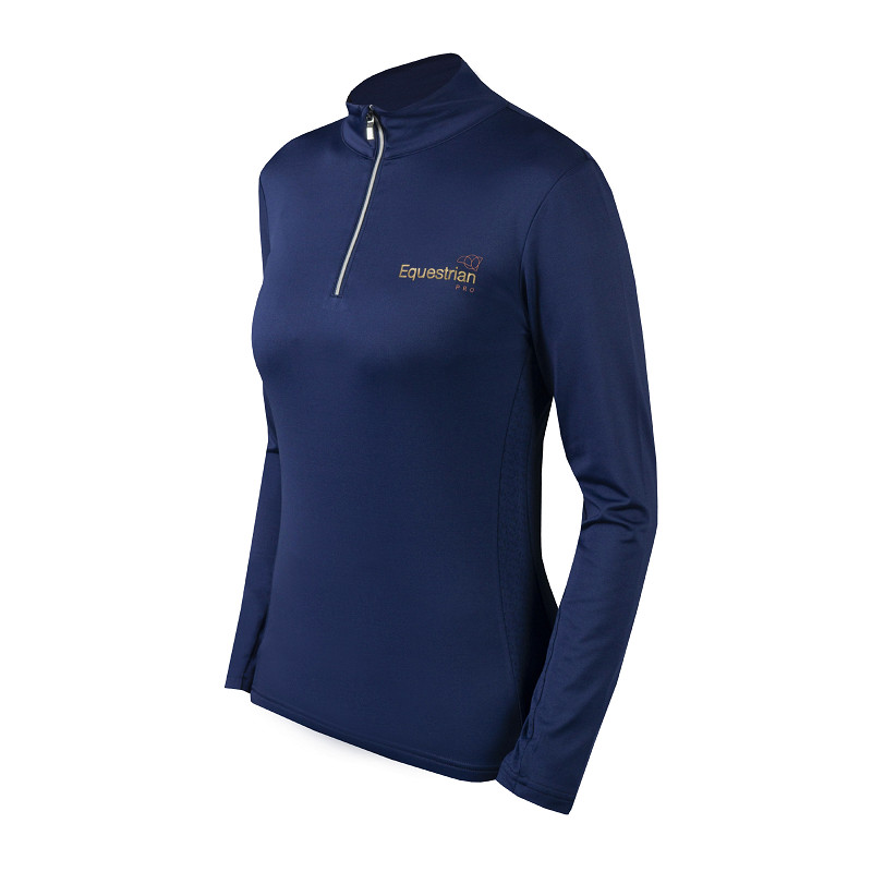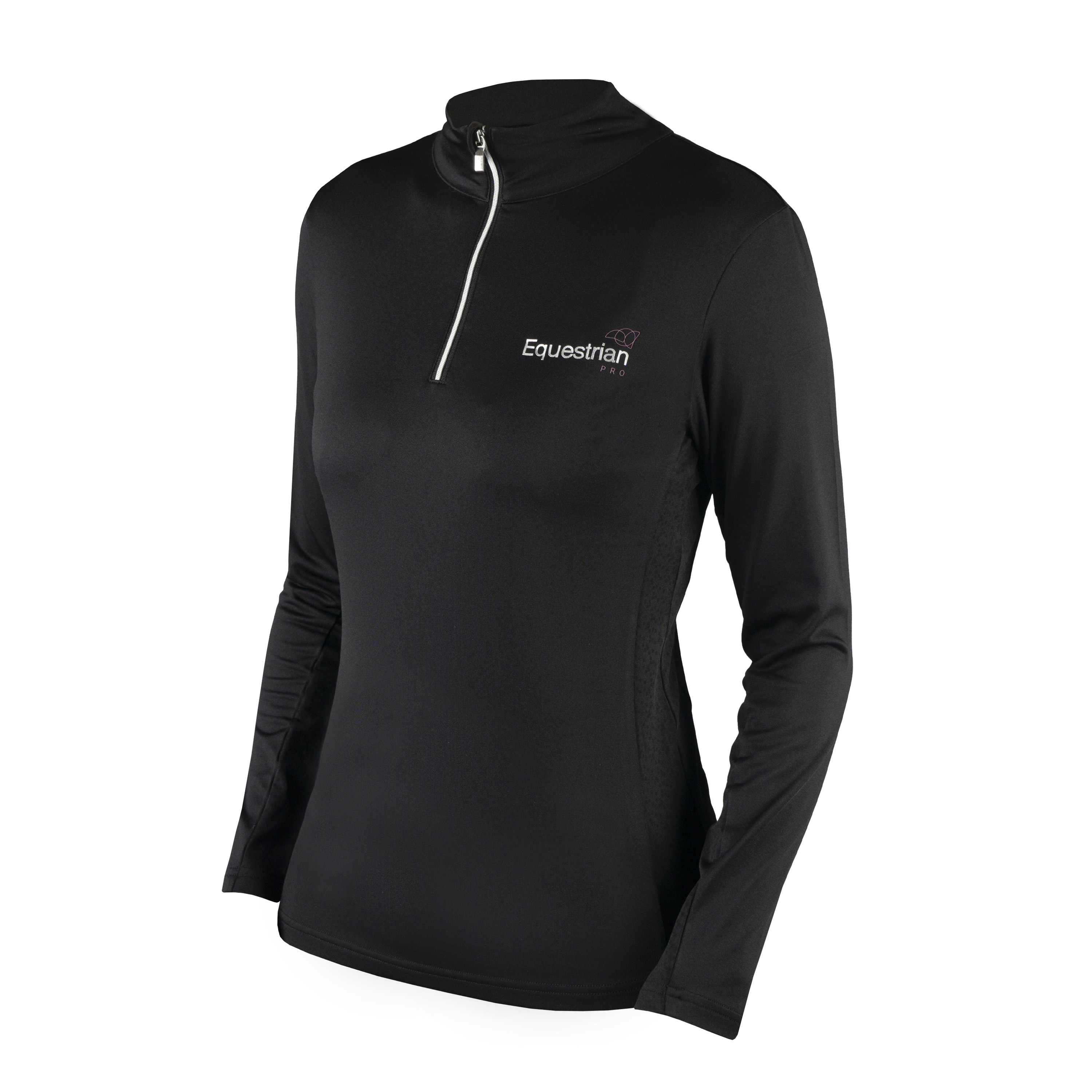 Women’s long-sleeved shirt made of a technical fabric treated with Polygiene to combat perspiration odor. The shirt has a nice turtleneck with zipper and a subtle tone-on-tone print on the side and arm panels. Product specifications: Lightweight breathable quick-drying technical fabric Treated with Polygiene and OdorCrunch to combat perspiration odor Minimal turtleneck Half zip at the front Tone-on-tone printed dots on the side and arm panels Equestrian Pro Trinity print on chest Material: 90% polyester 10% elastane 200 gsm. Brushed inside. Treated with Polygiene/OdorCrunch